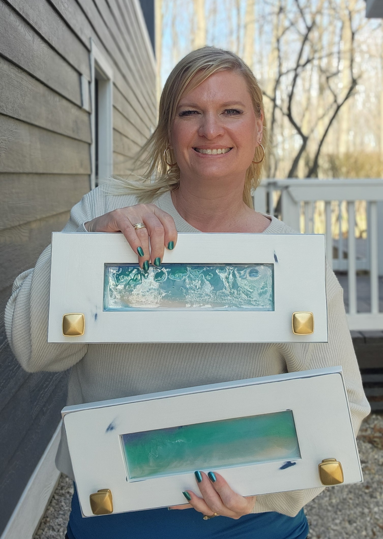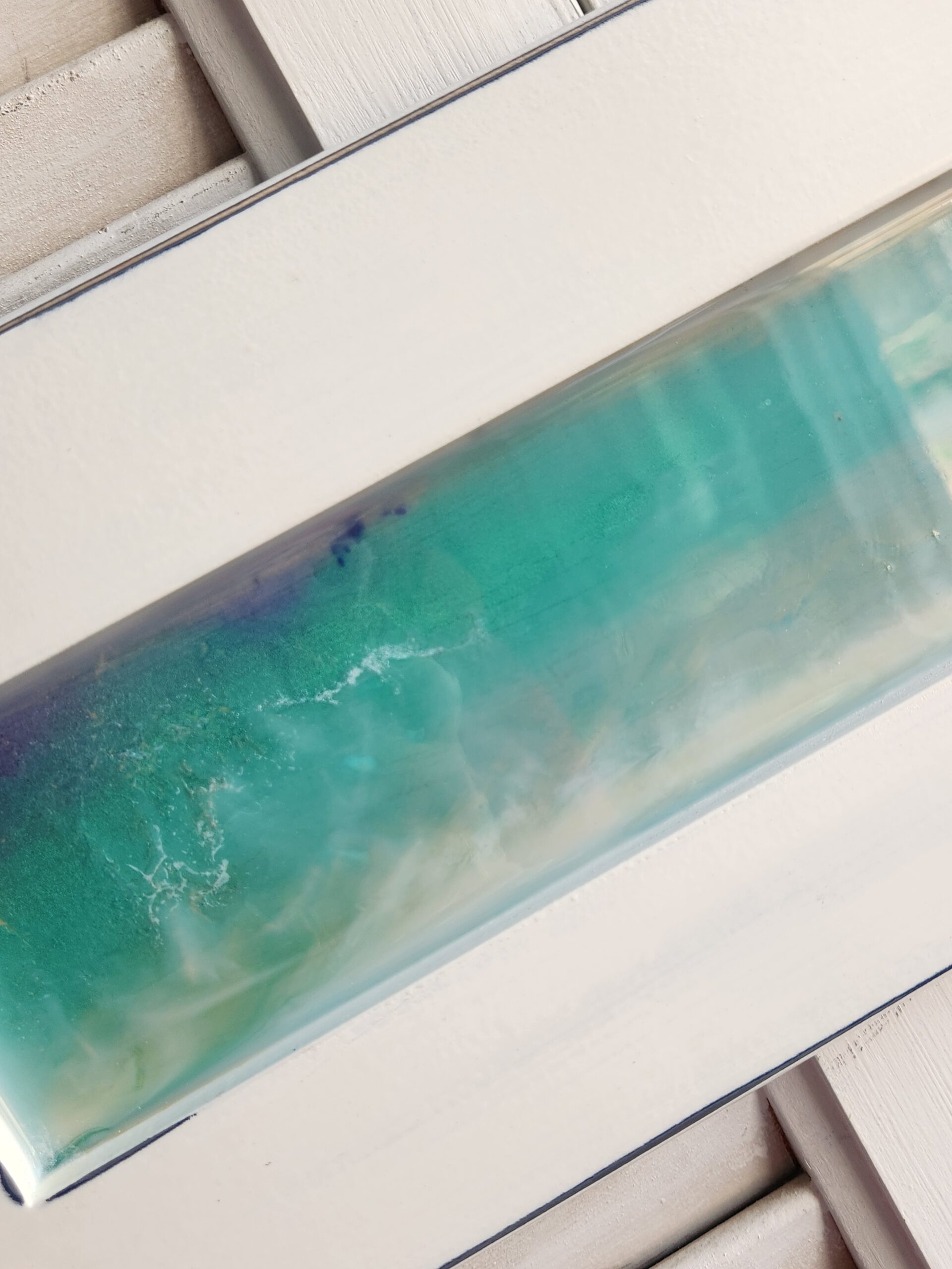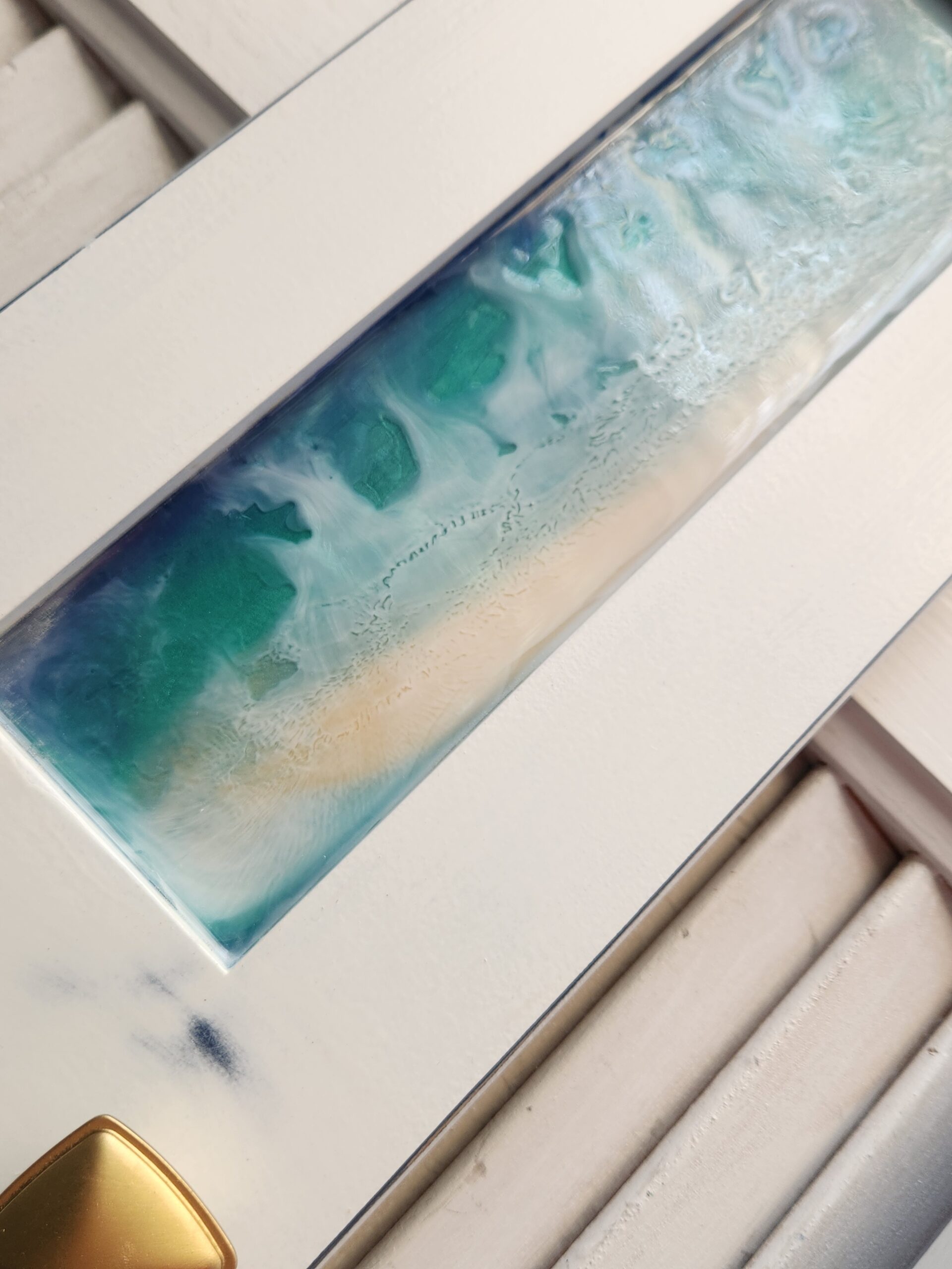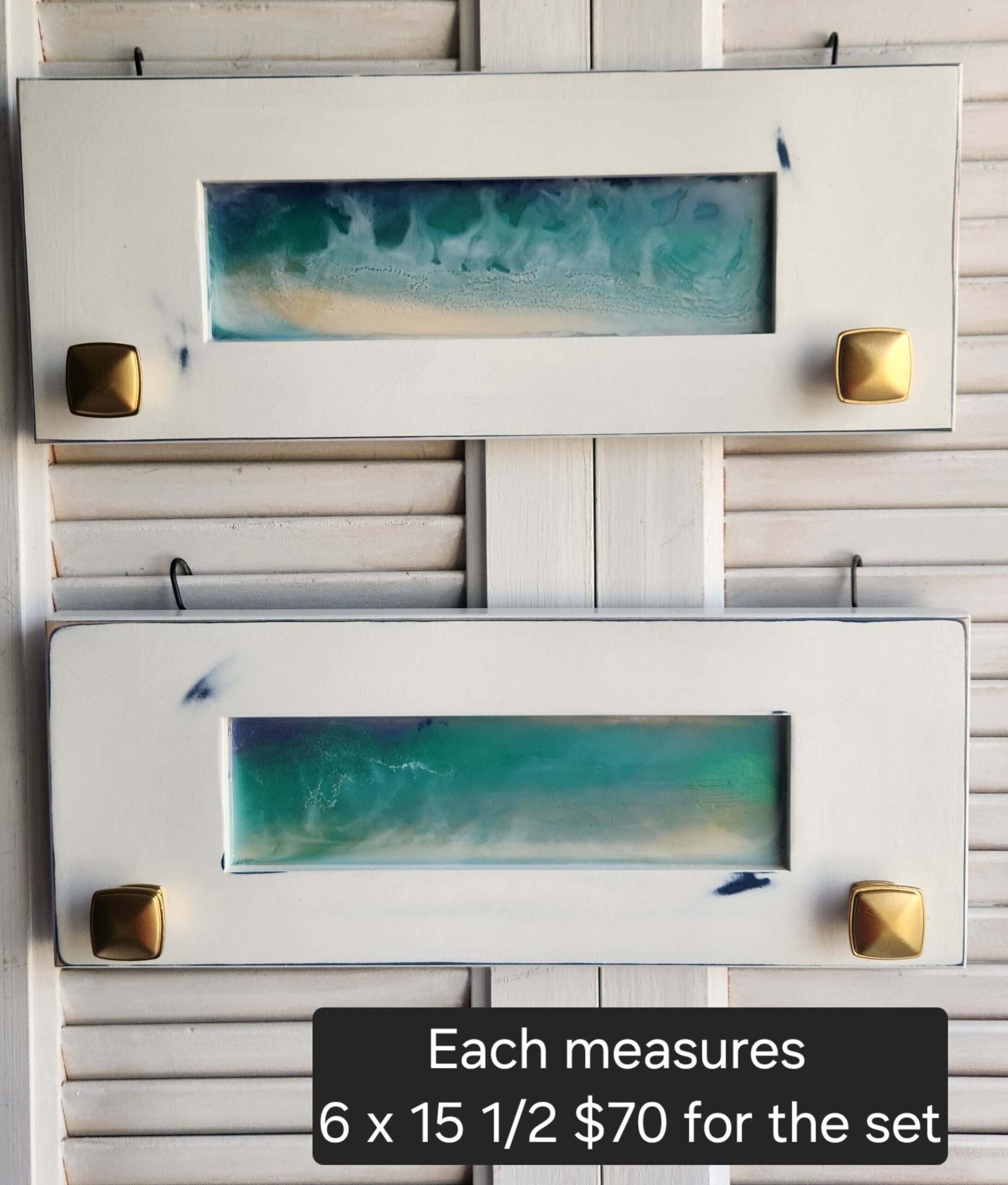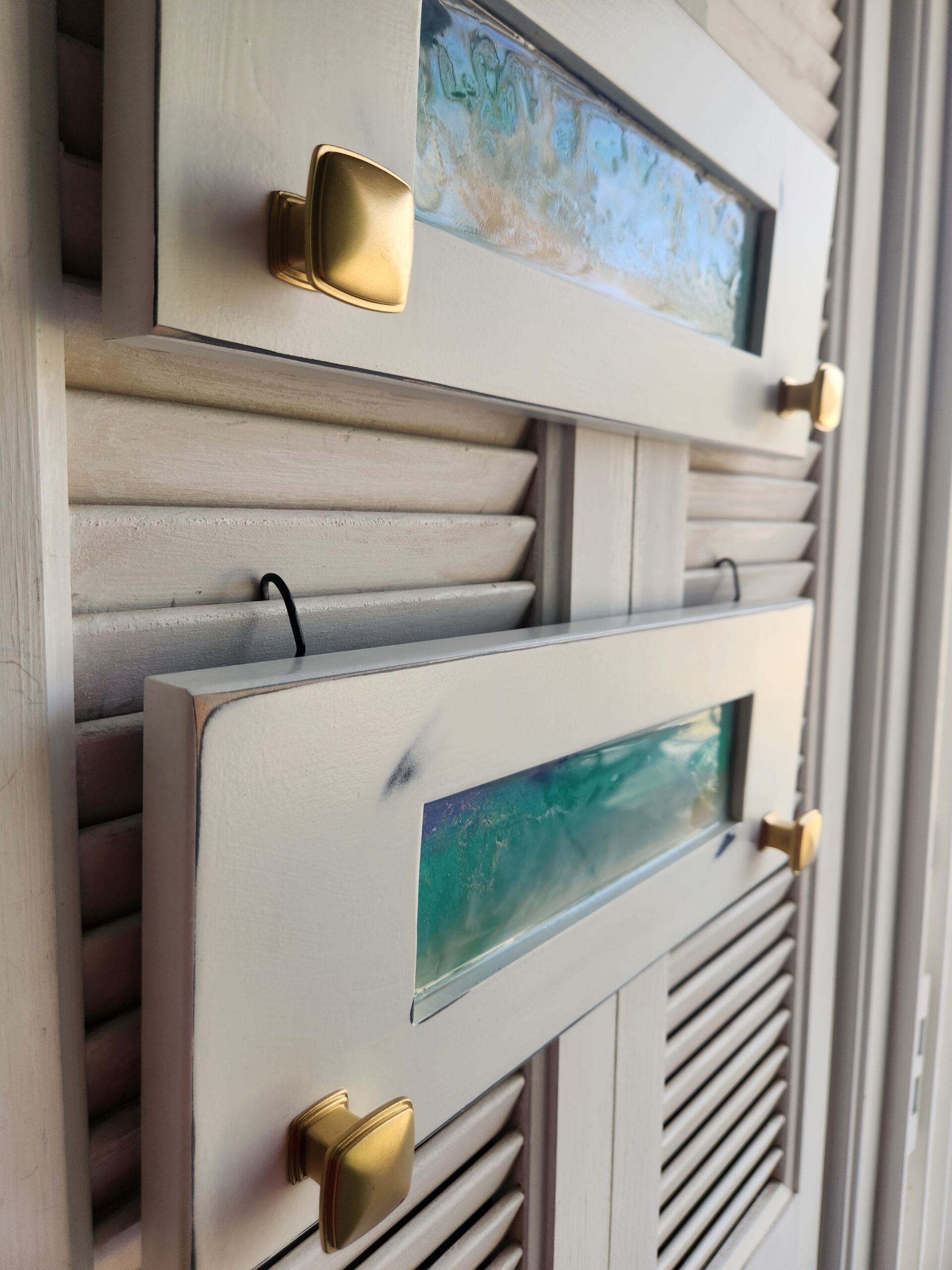 Add a touch of the lake to your home with these handmade coastal wall hooks. Each piece features a beautiful epoxy resin design that resembles turquoise lake water washing onto a sandy shore, creating a calming beach-inspired look. The white wood frame highlights the vibrant resin artwork while the gold hooks add a modern and elegant accent.