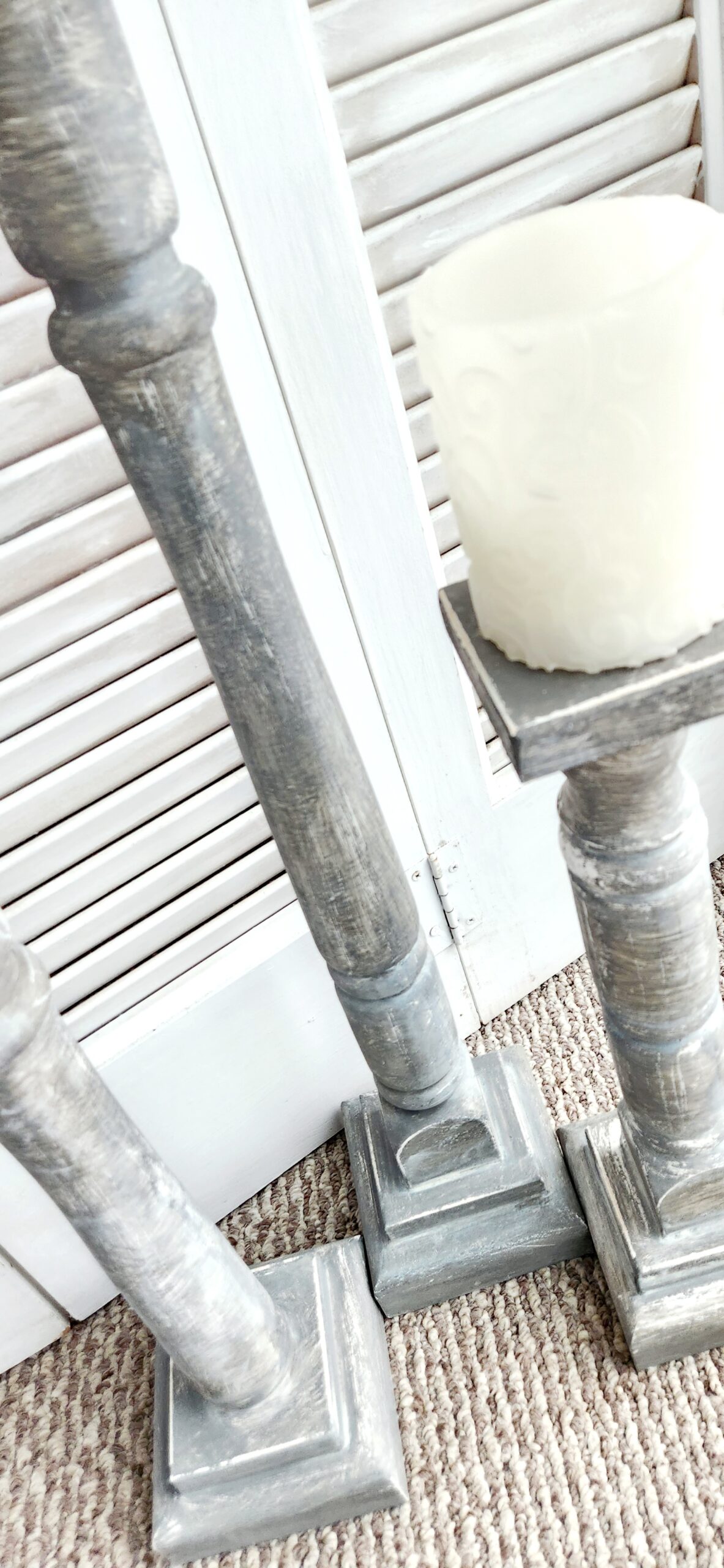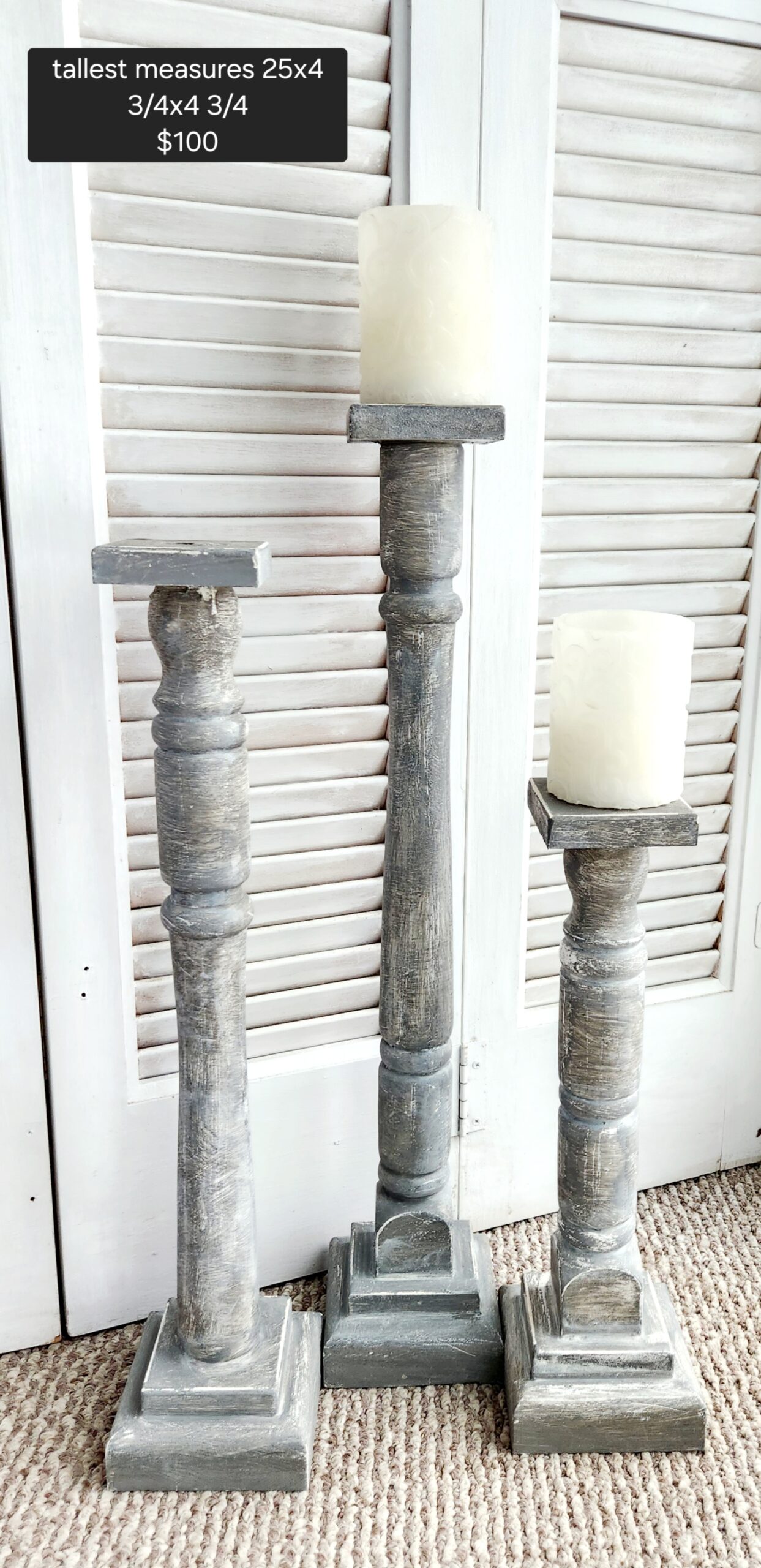 Add a touch of farmhouse elegance to your home with these floor candle stands, crafted from sturdy solid wood table legs. Perfect for creating a warm, inviting atmosphere with a unique, upcycled design. Candles not included.