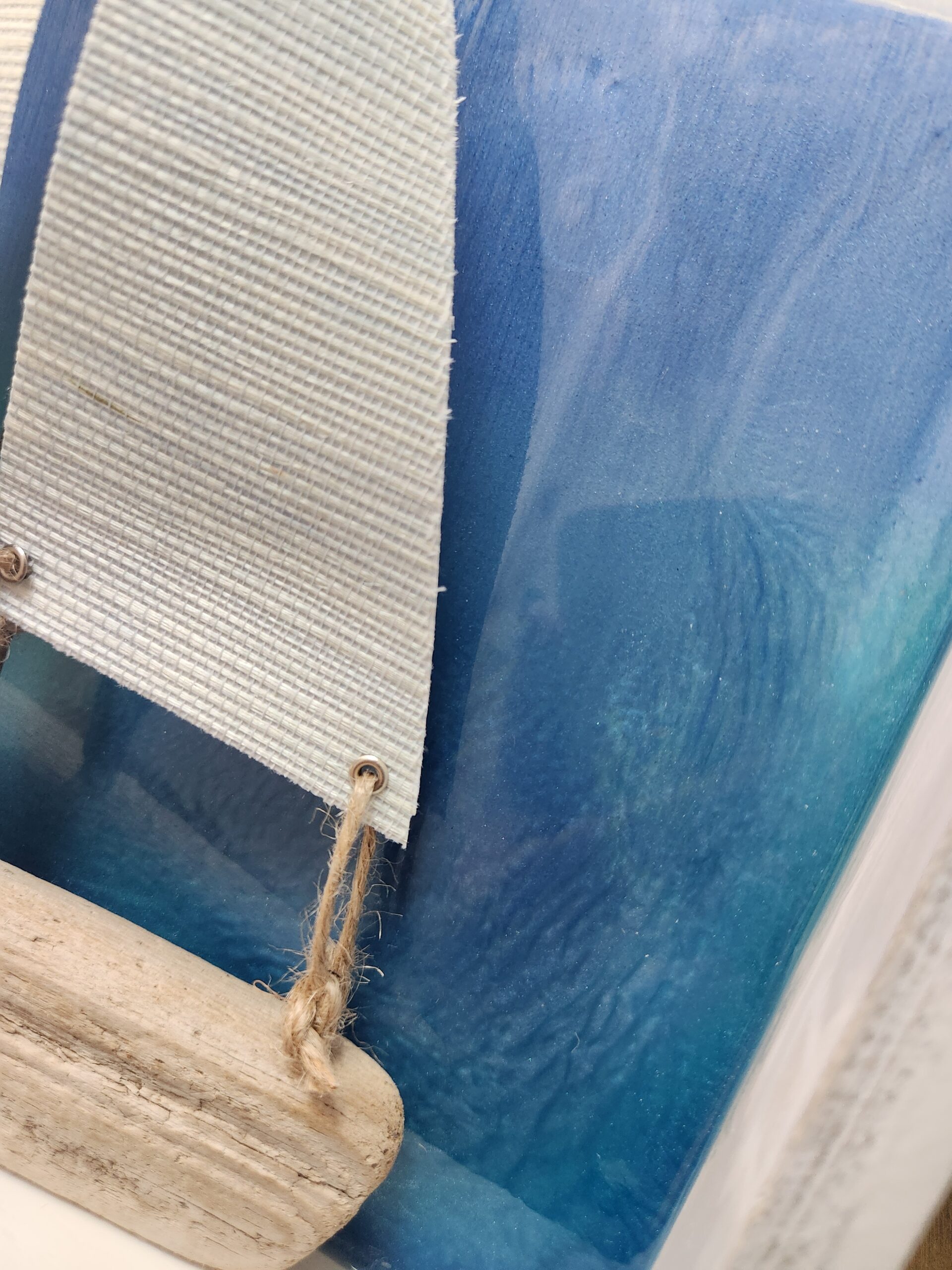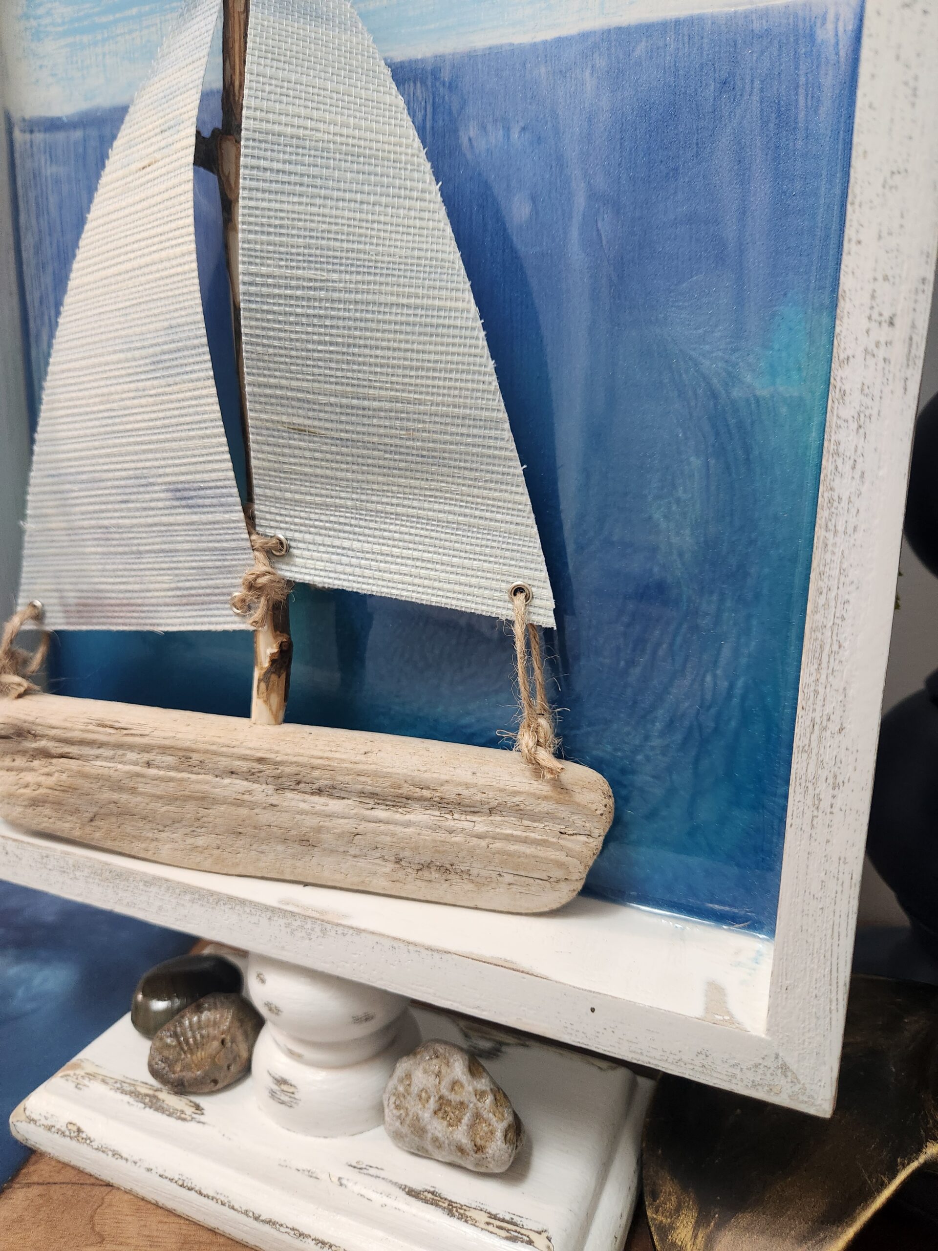 Bring the peaceful beauty of the shoreline into your home with this one-of-a-kind driftwood sailboat art piece. Featuring natural driftwood, textured sails, and a stunning epoxy resin lake backdrop, this piece captures the calm and beauty of lake life.