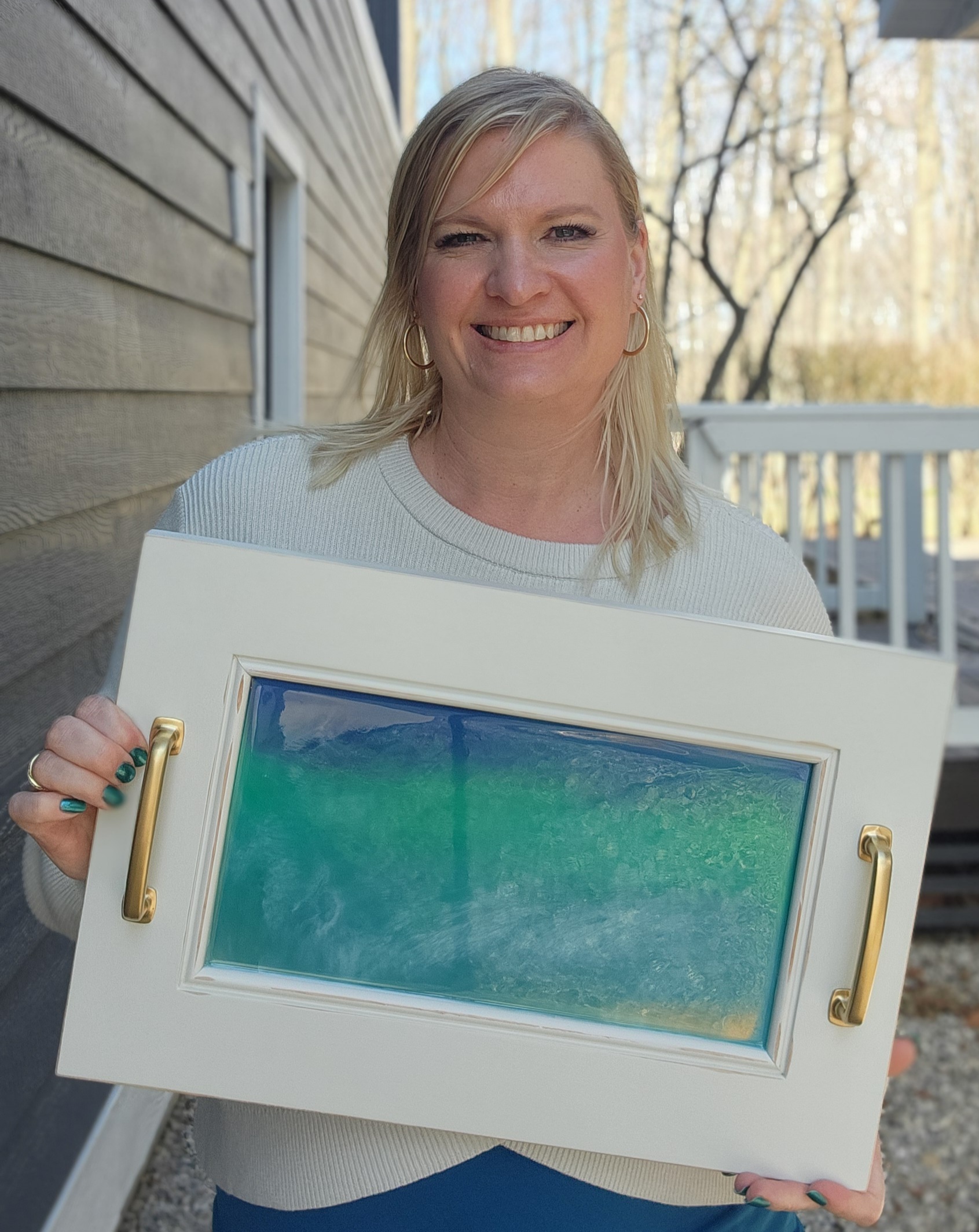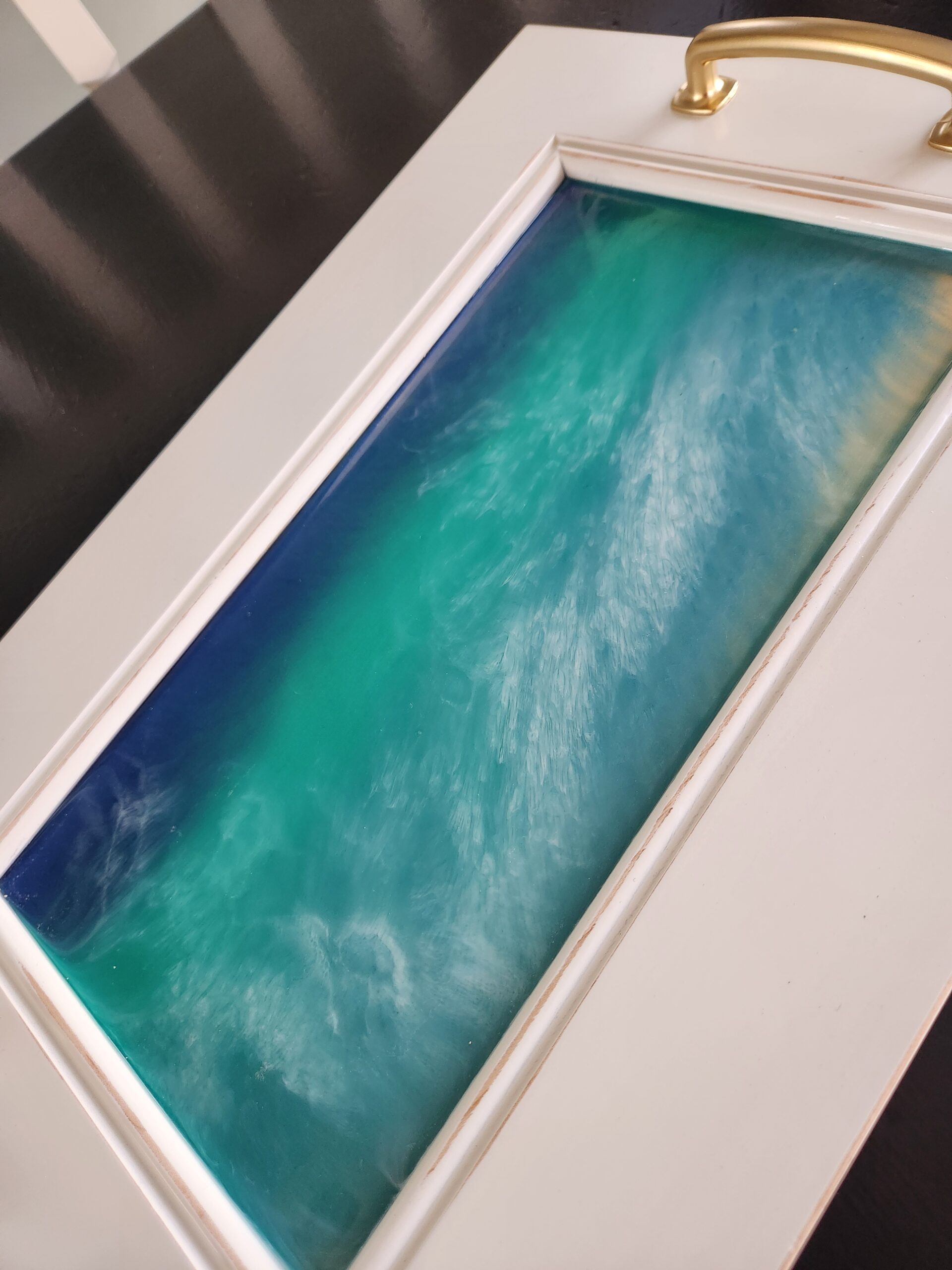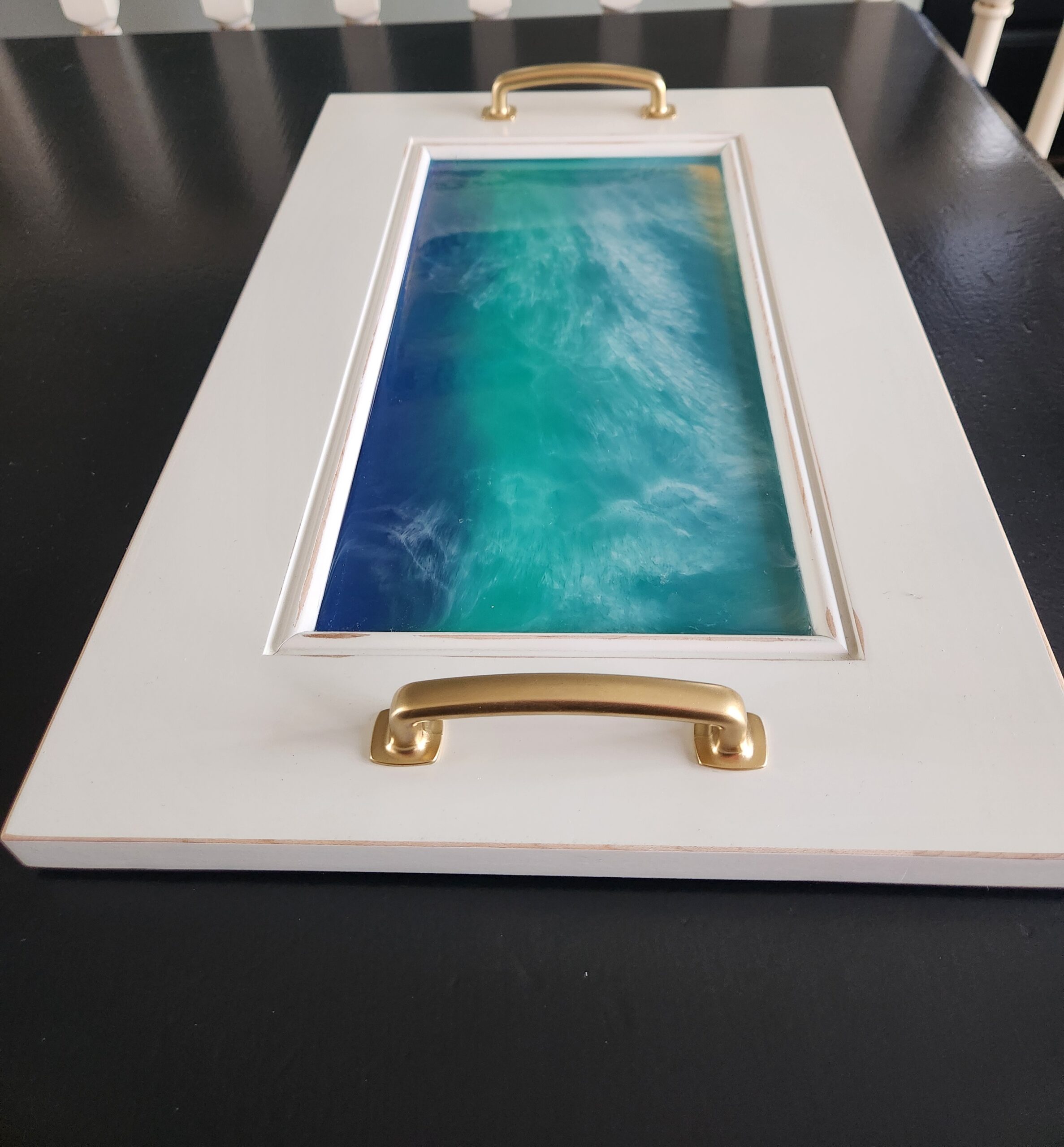 This wood and resin serving tray also works great as a coffee table tray or decorative centerpiece.