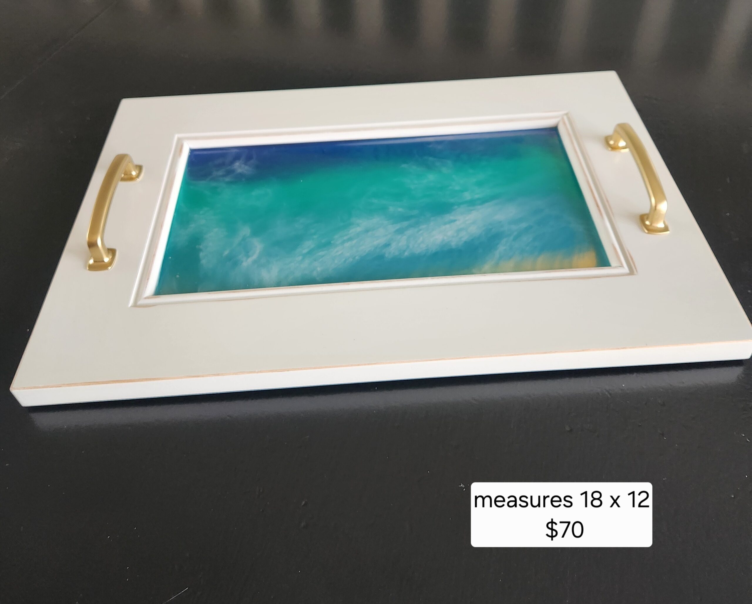 Beautiful, handcrafted wood serving tray with epoxy resin water effect that gives the look of clear flowing water across wood. Each tray is unique and perfect for adding a rustic yet modern touch to your home.