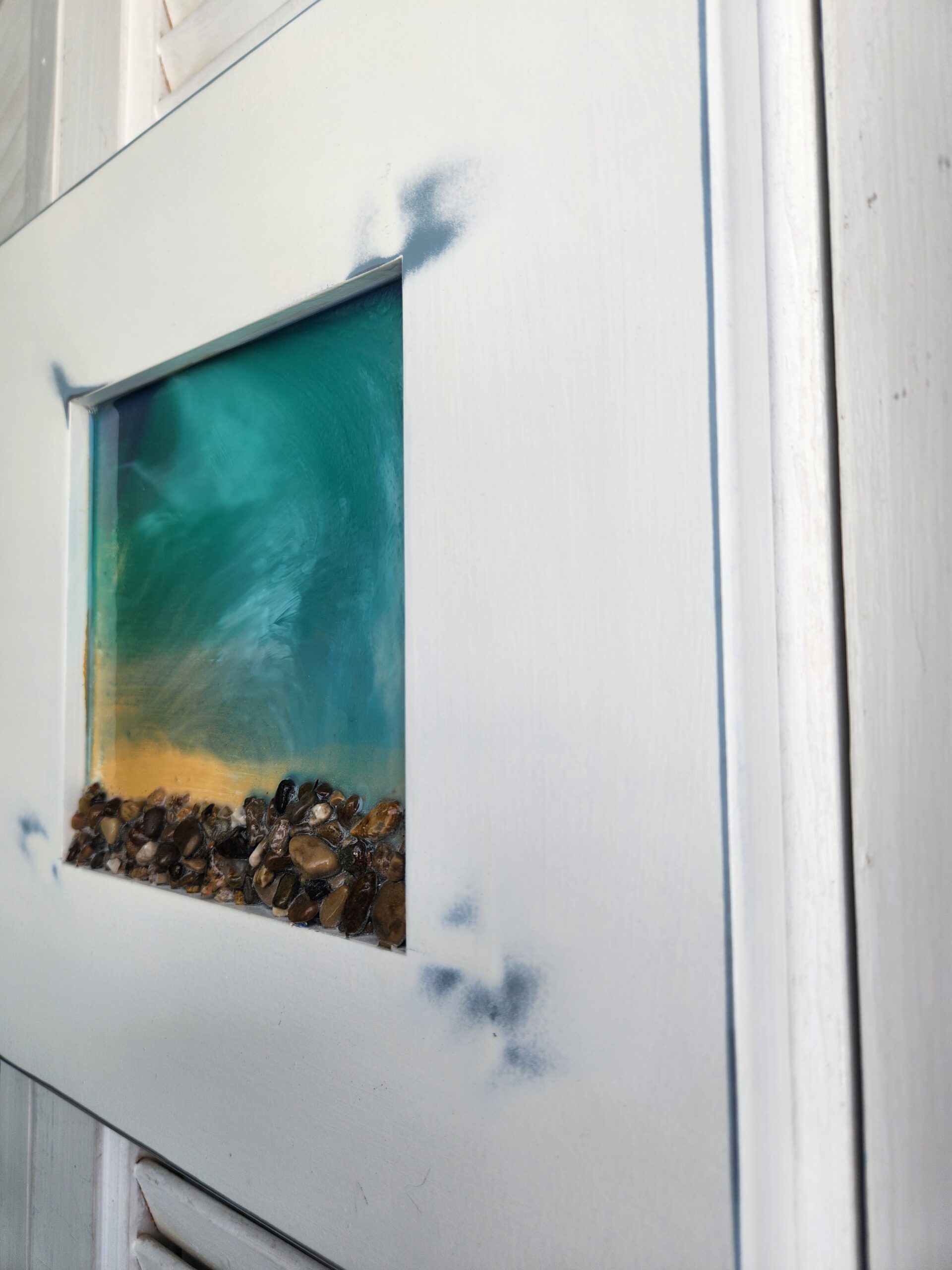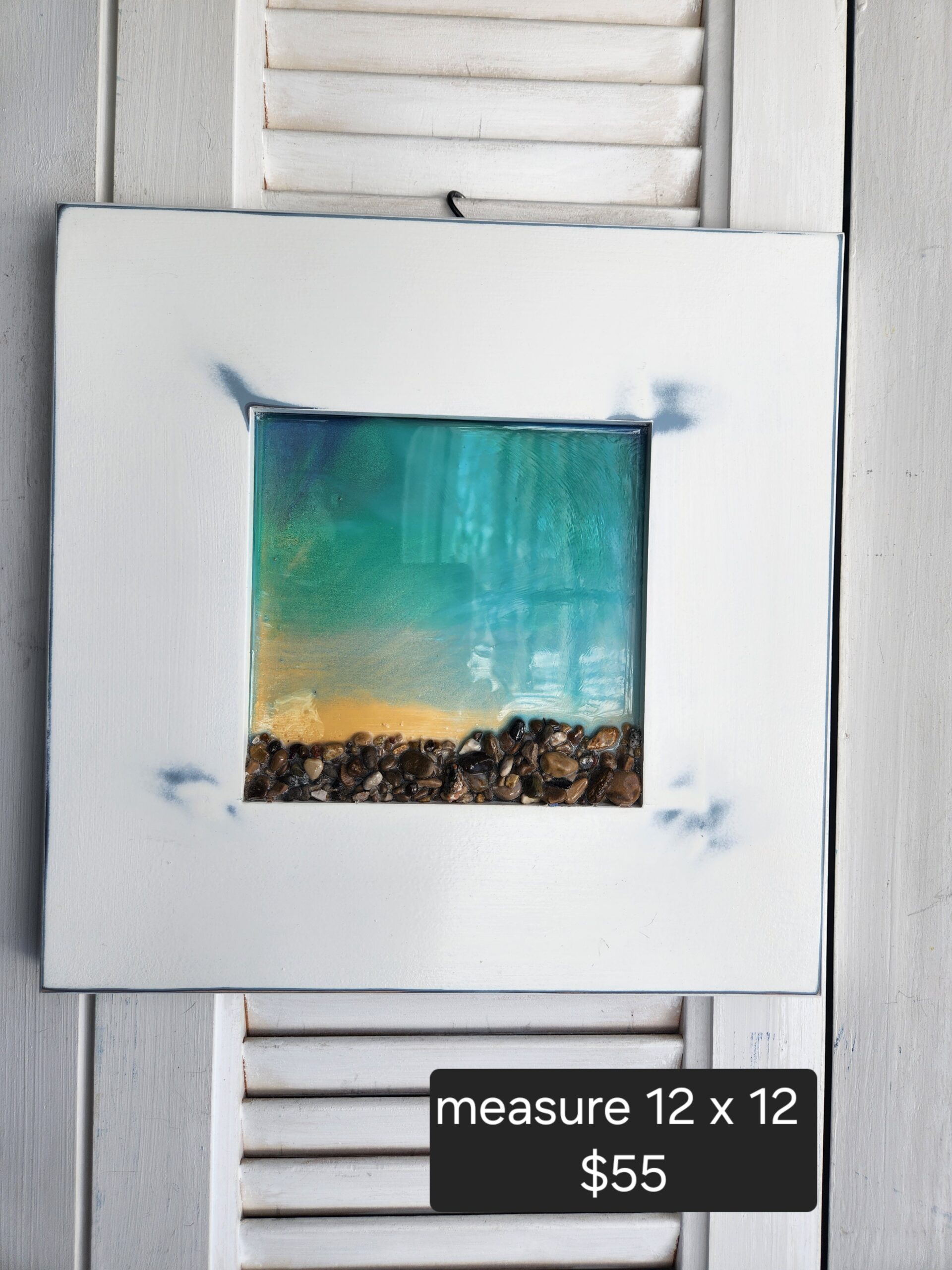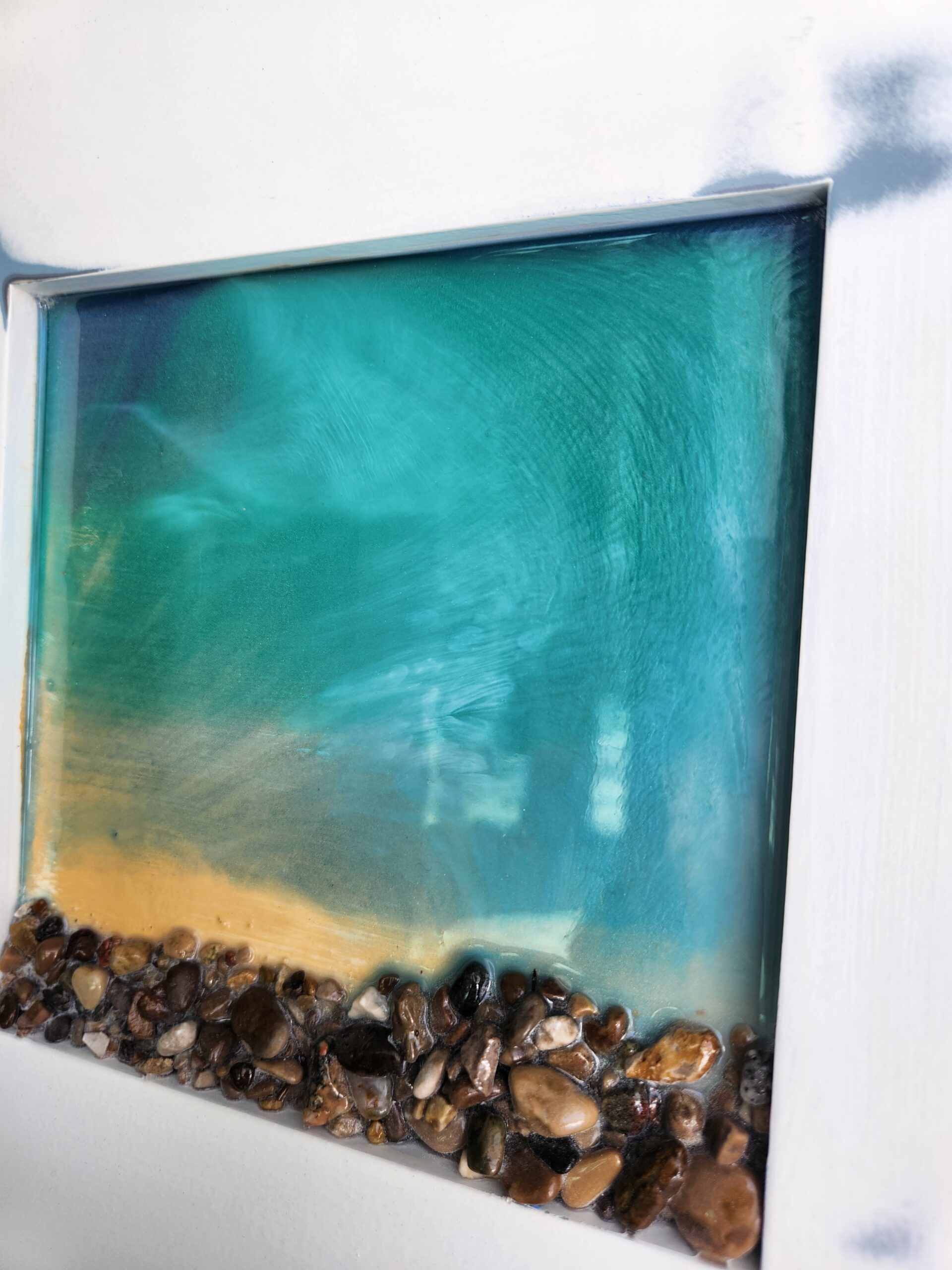 Beautiful resin pour lake art on solid wood with natural stones. This handcrafted wall hanging captures the peaceful look of water along the shoreline, with layered resin creating depth and movement just like a real lake. The natural rocks add a rustic, shoreline feel, making it a perfect piece for lake house decor, cottage style homes, or anyone who loves nature-inspired art.
