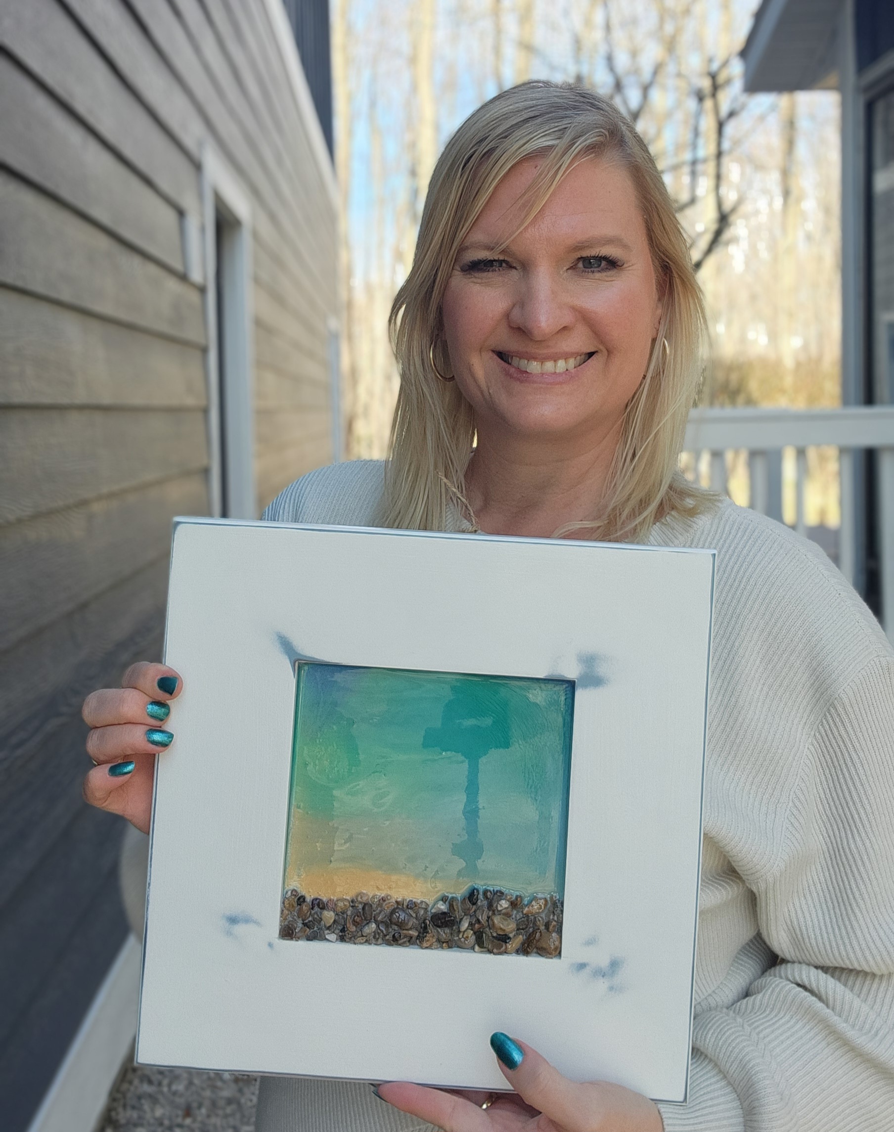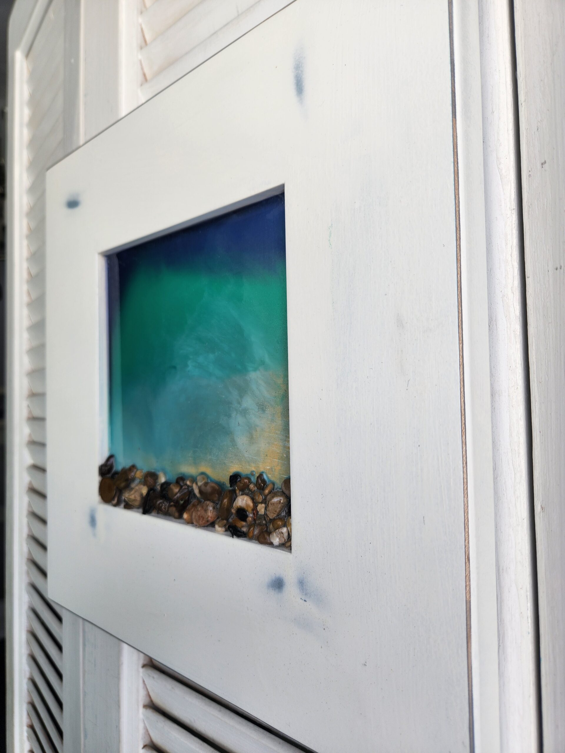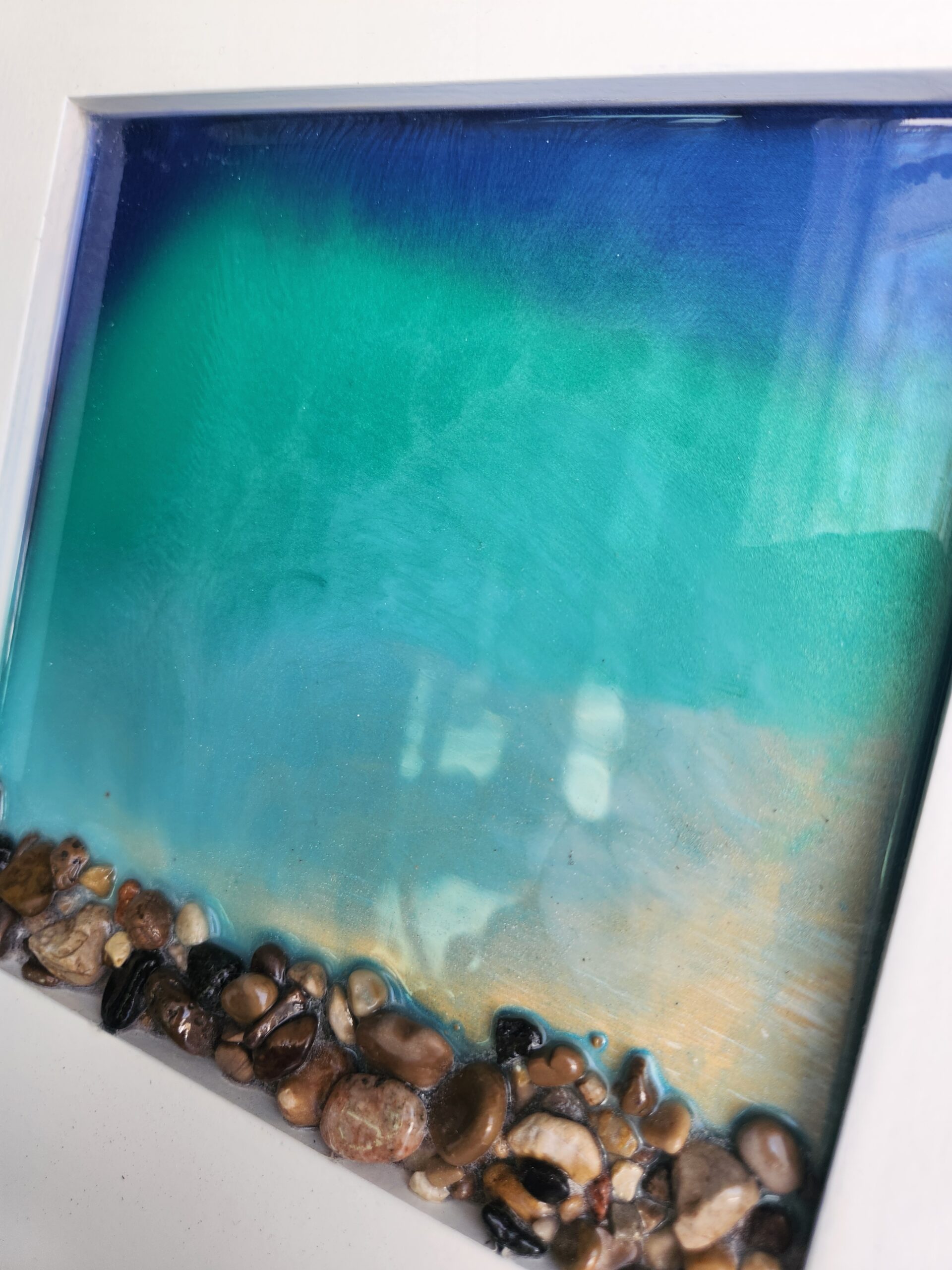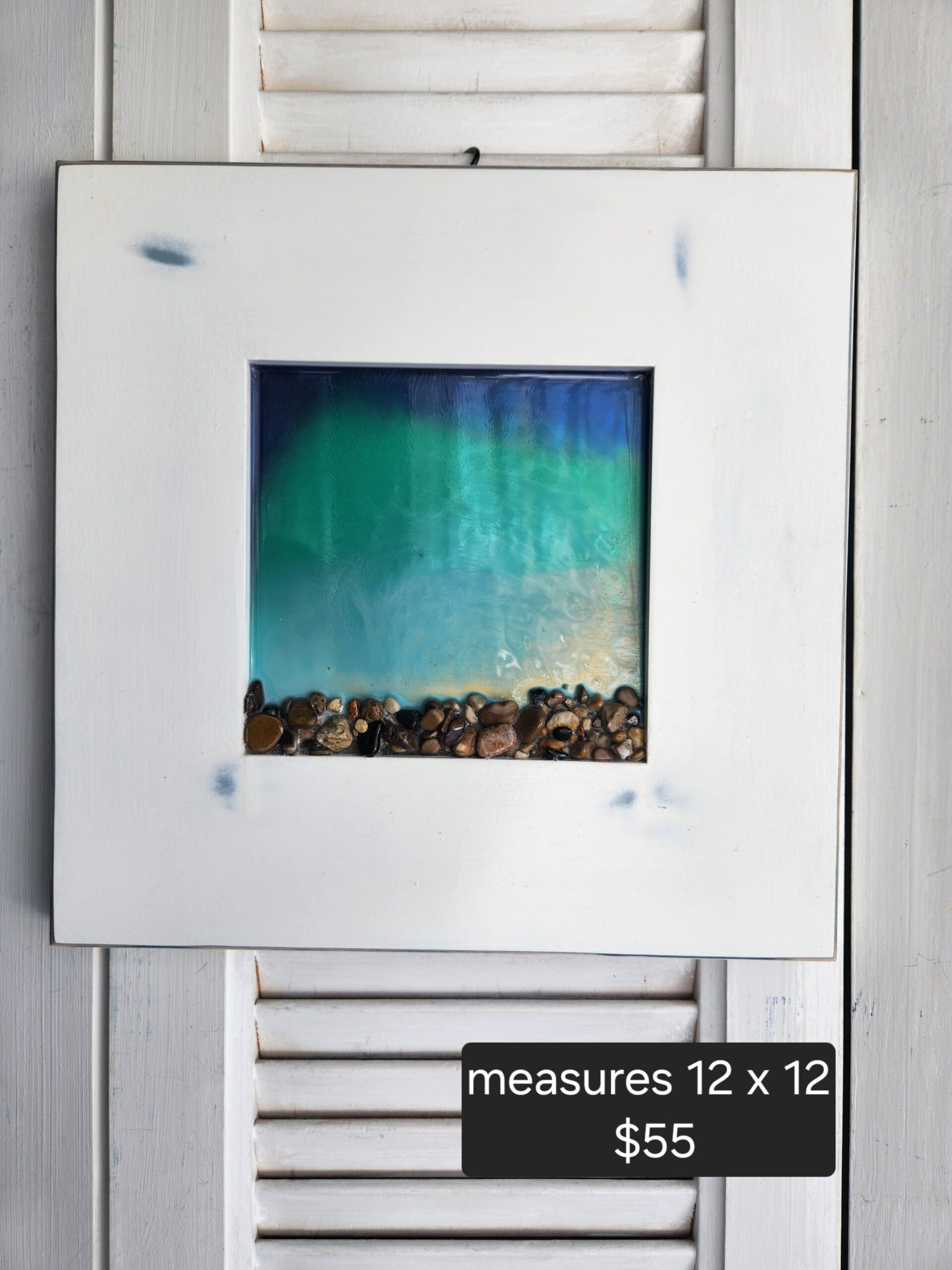 Beautiful resin pour lake art on solid wood with natural stones. This handcrafted wall hanging captures the peaceful look of water along the shoreline, with layered resin creating depth and movement just like a real lake. The natural rocks add a rustic, shoreline feel, making it a perfect piece for lake house decor, cottage style homes, or anyone who loves nature-inspired art.