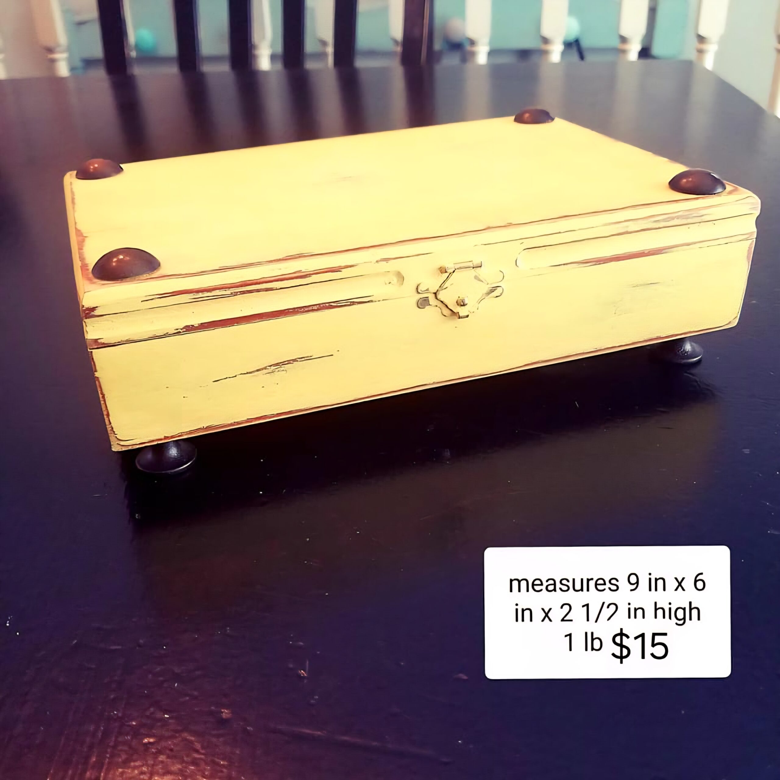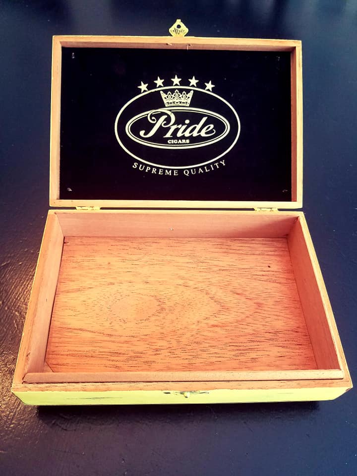 Give your space a unique touch with this repurposed cigar box! Beautifully painted and elevated with feet, it’s perfect for storing jewelry, keepsakes, or small treasures. A one-of-a-kind piece with vintage charm!