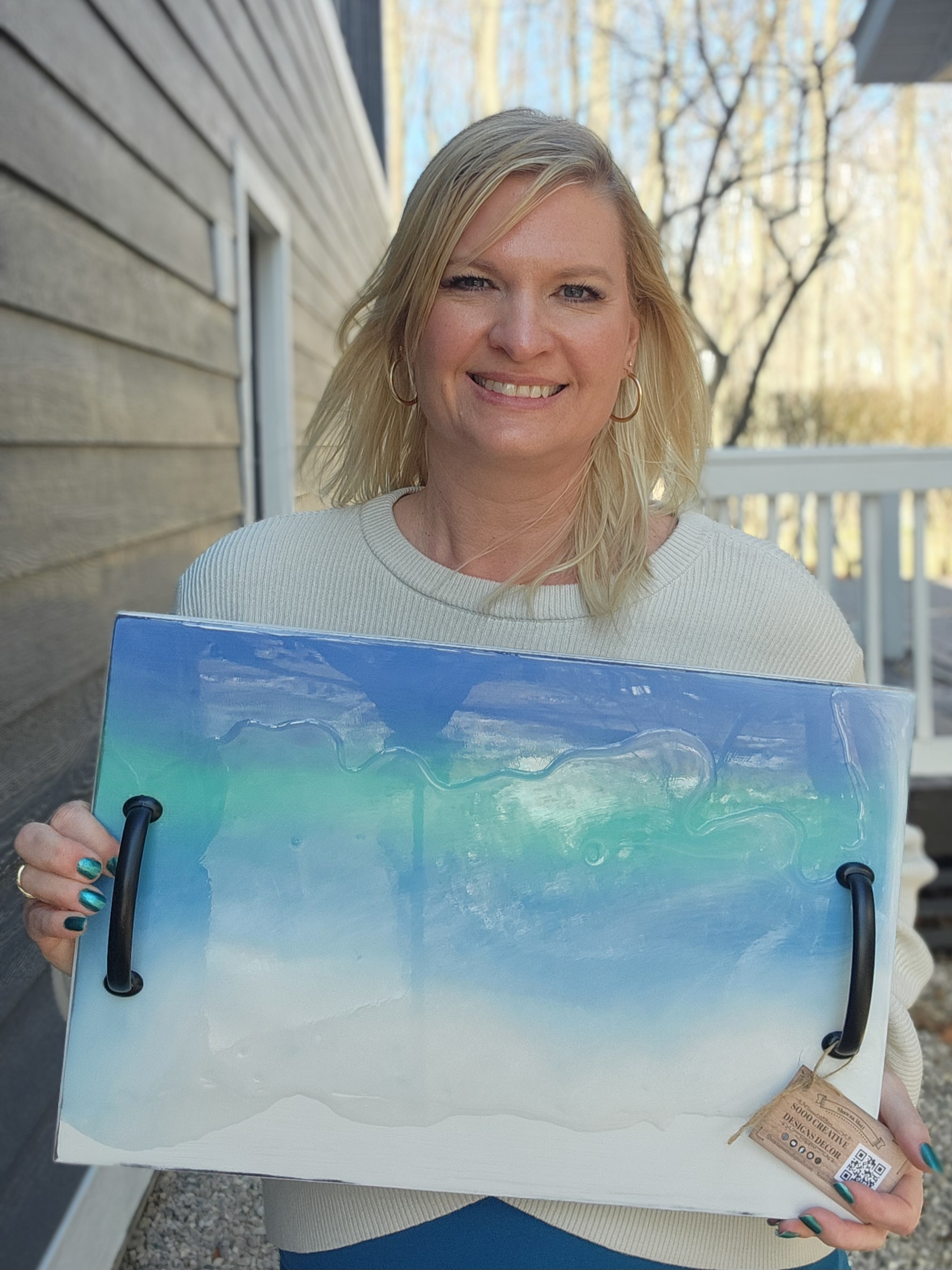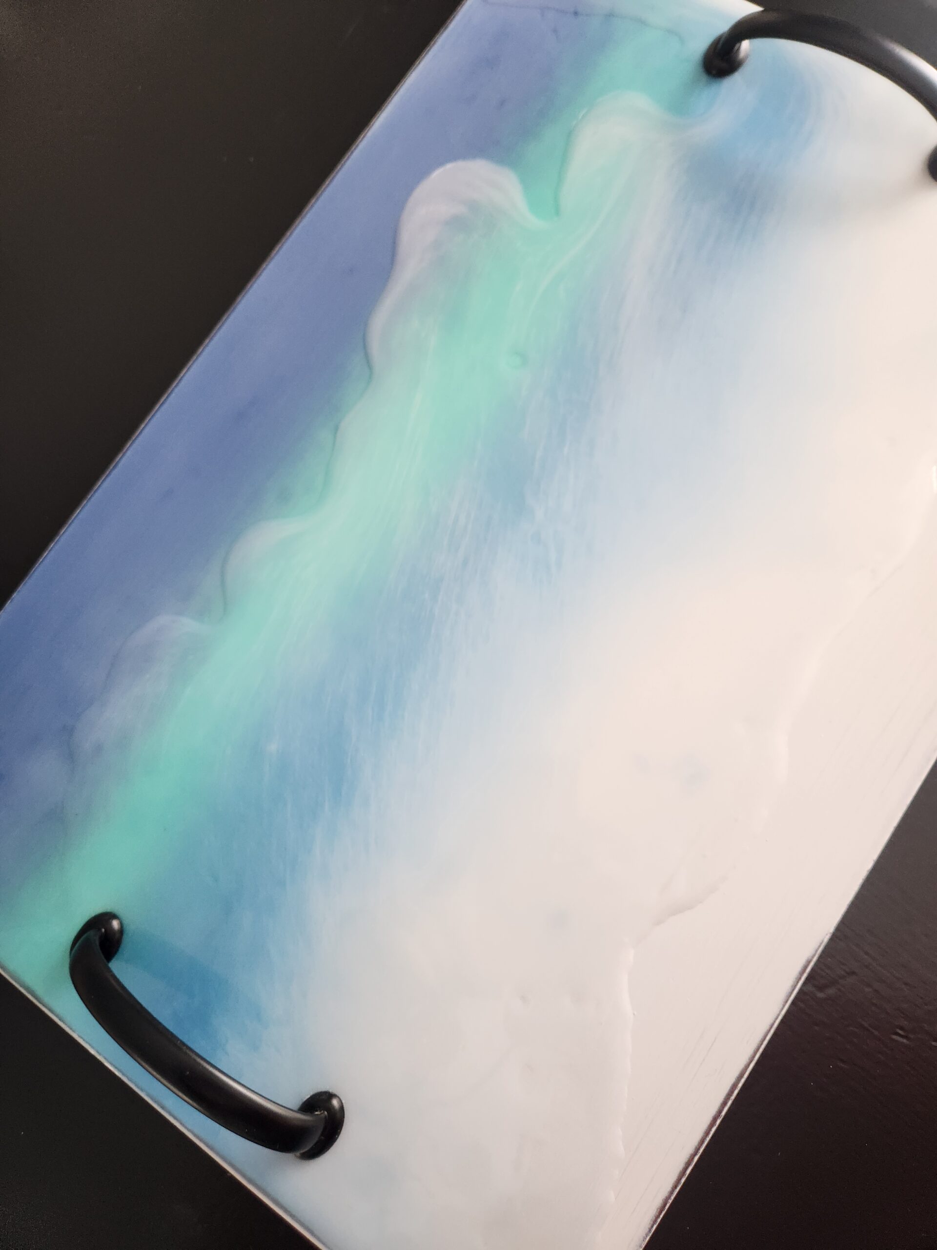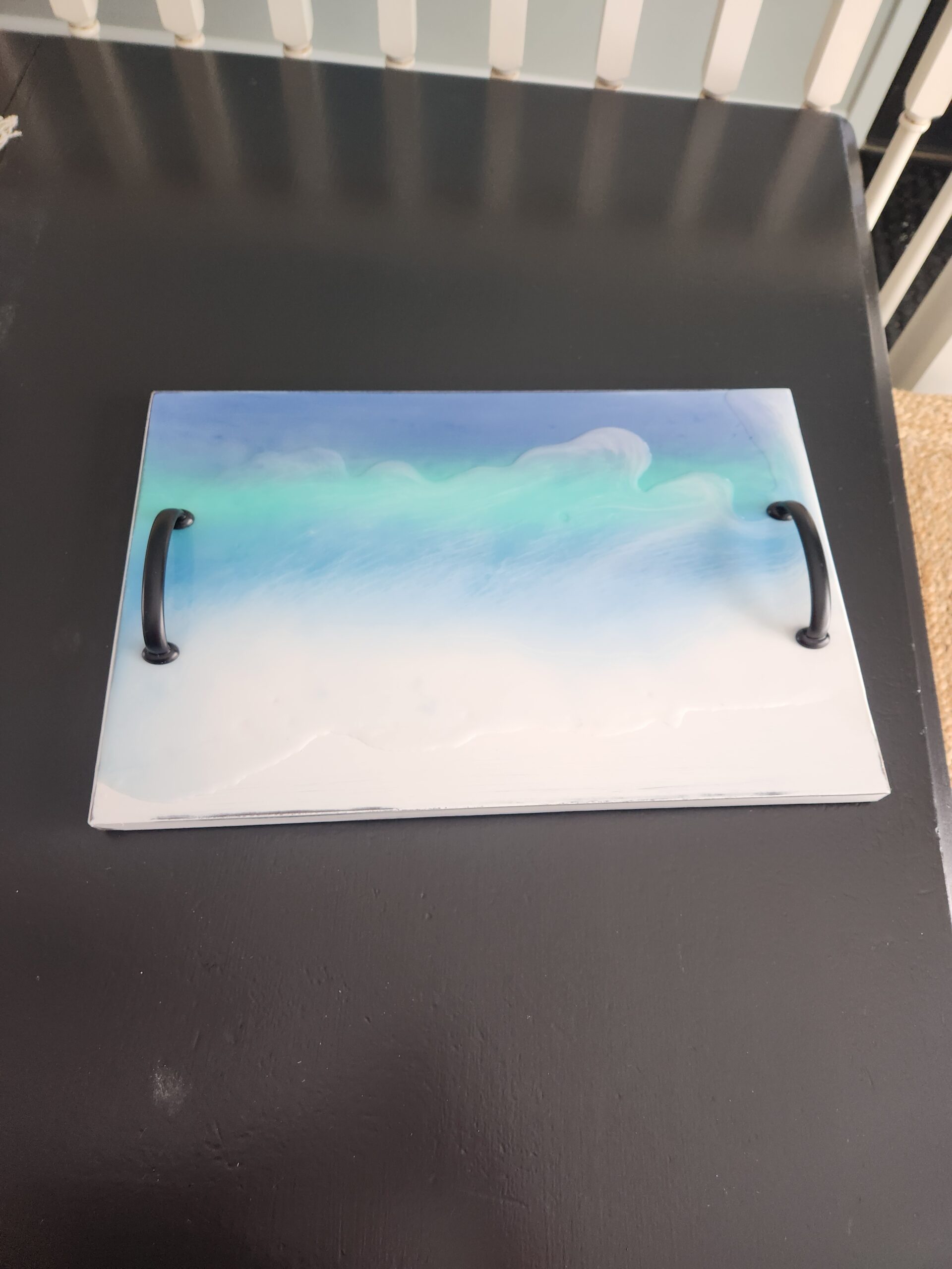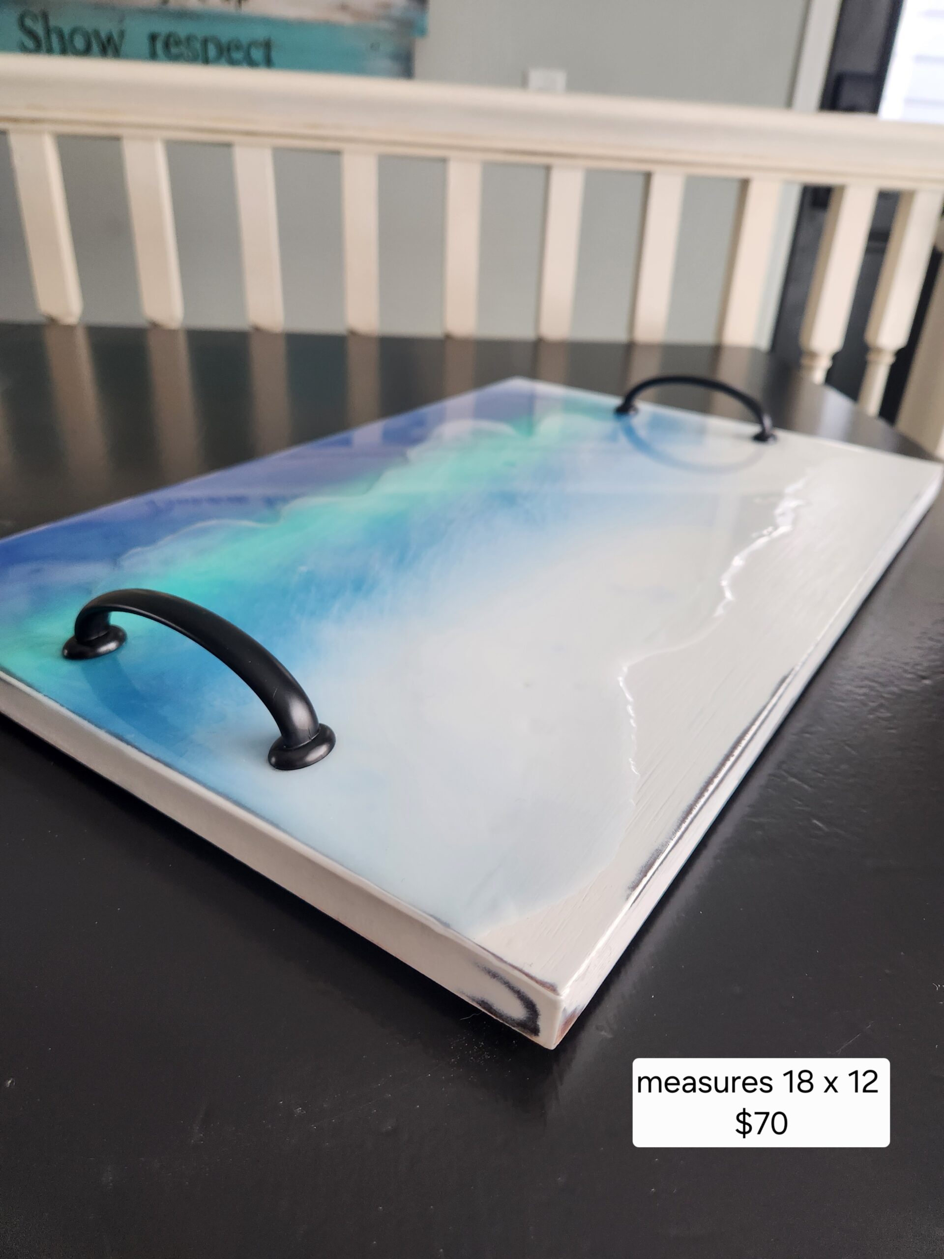 Beautiful solid wood serving tray with a resin pour lake design, creating the look of peaceful water along a shoreline. The layered resin adds depth and movement, giving it a realistic lake-inspired appearance. Finished with sturdy handles, making it both decorative and functional.