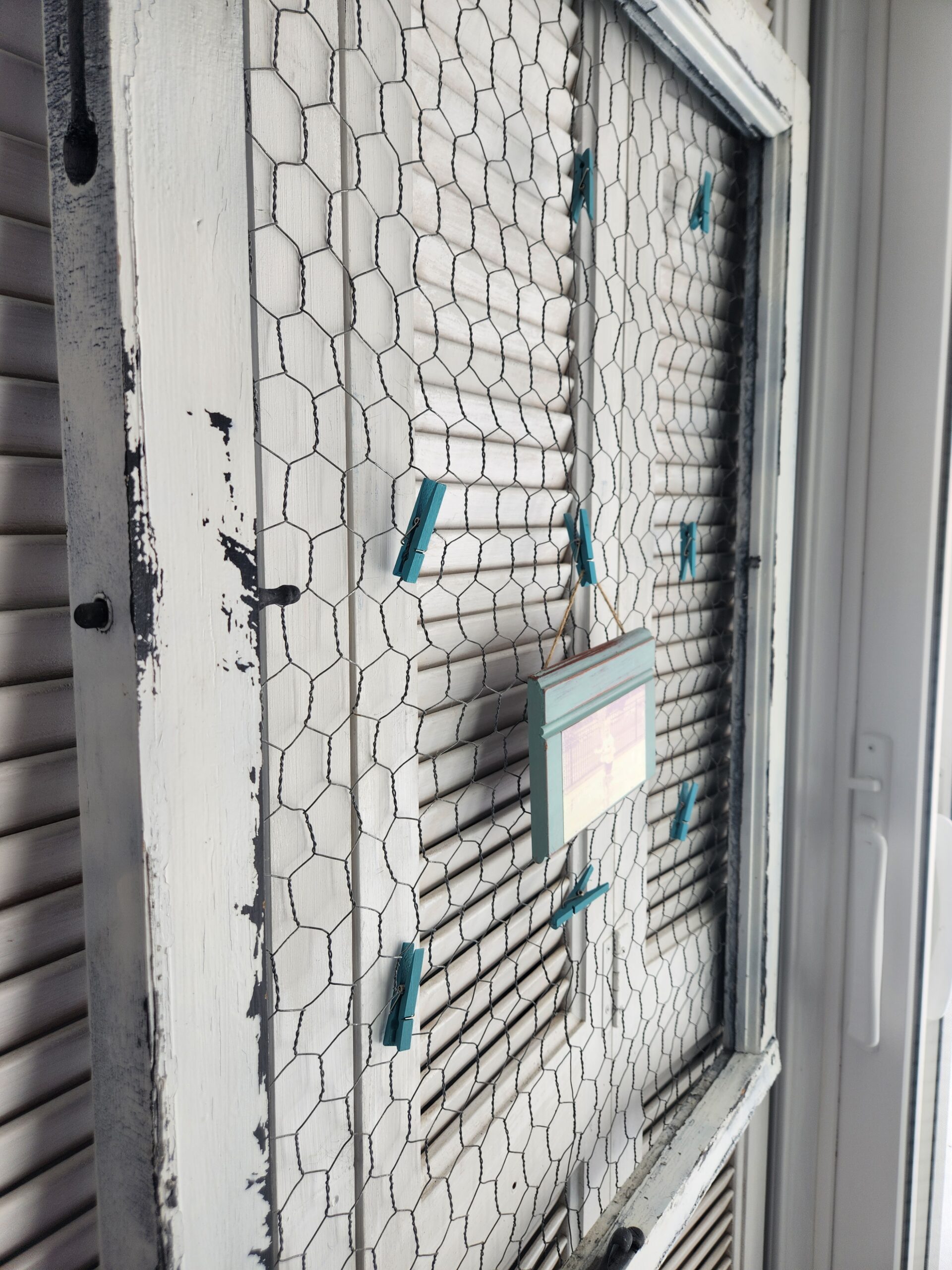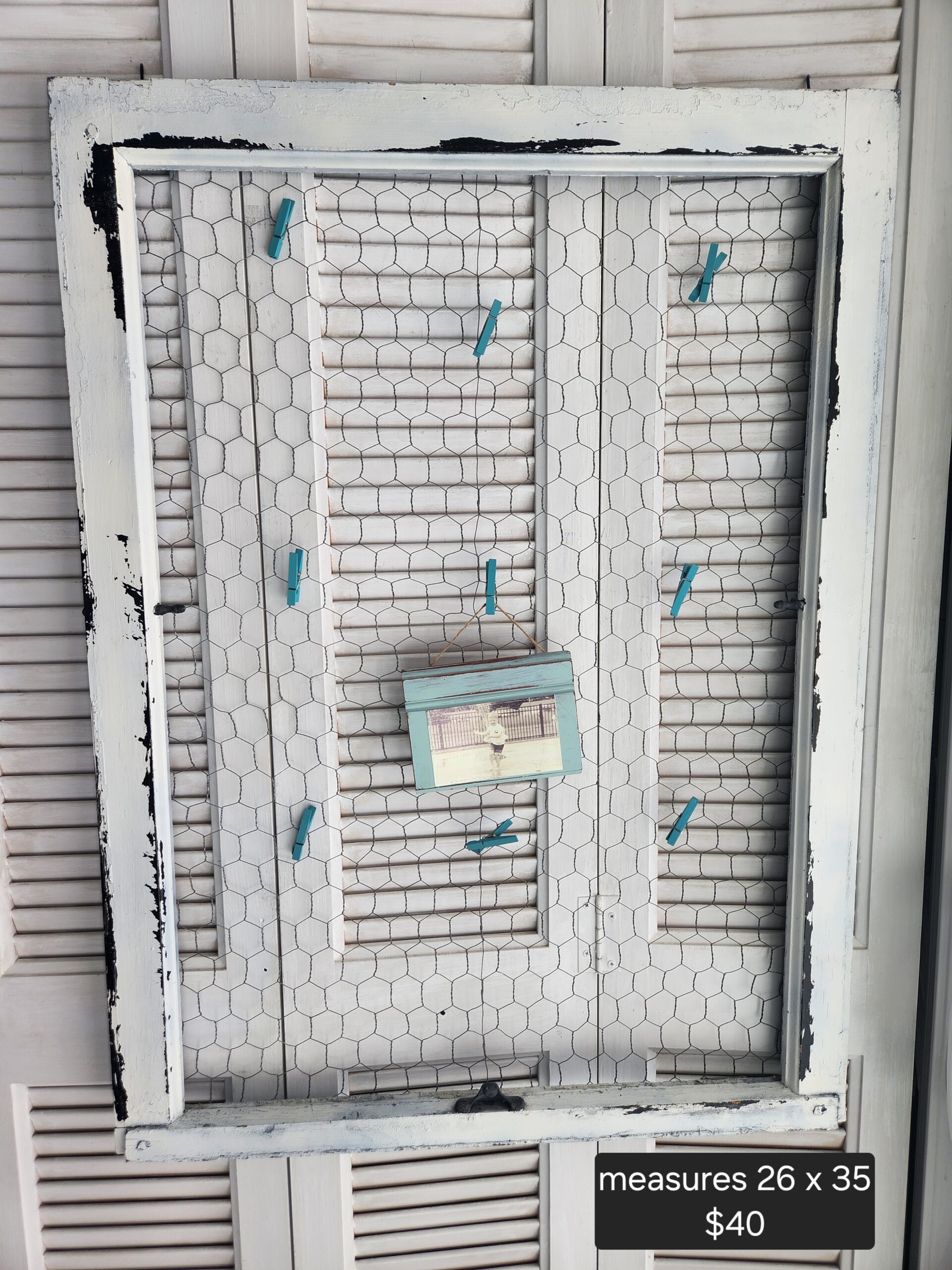 Give your home a unique vintage touch with this repurposed old window frame featuring chicken wire and clothespins. Perfect for displaying family photos, kids’ artwork, postcards, or seasonal decorations. This charming piece adds beautiful farmhouse and rustic style to any room.