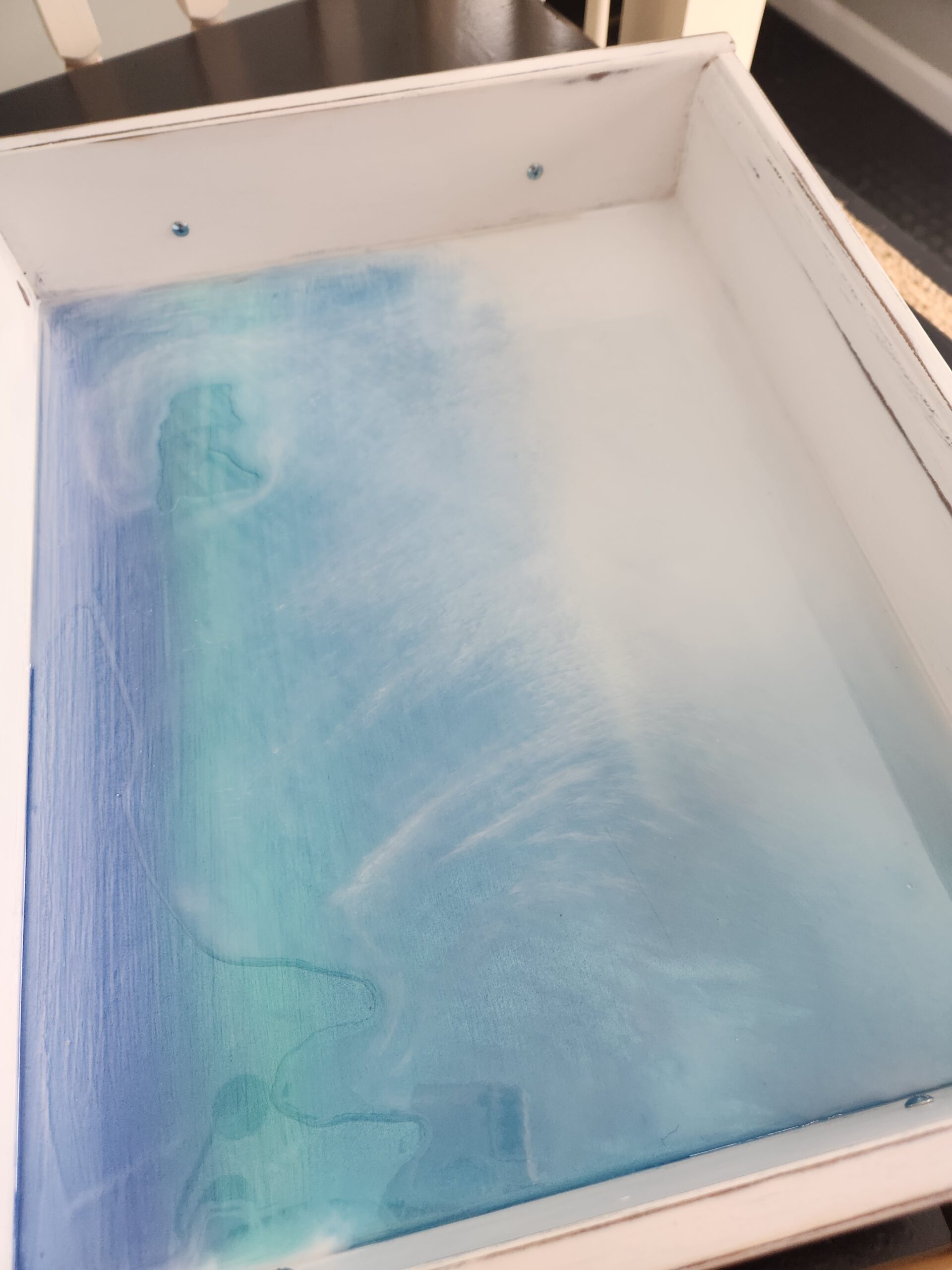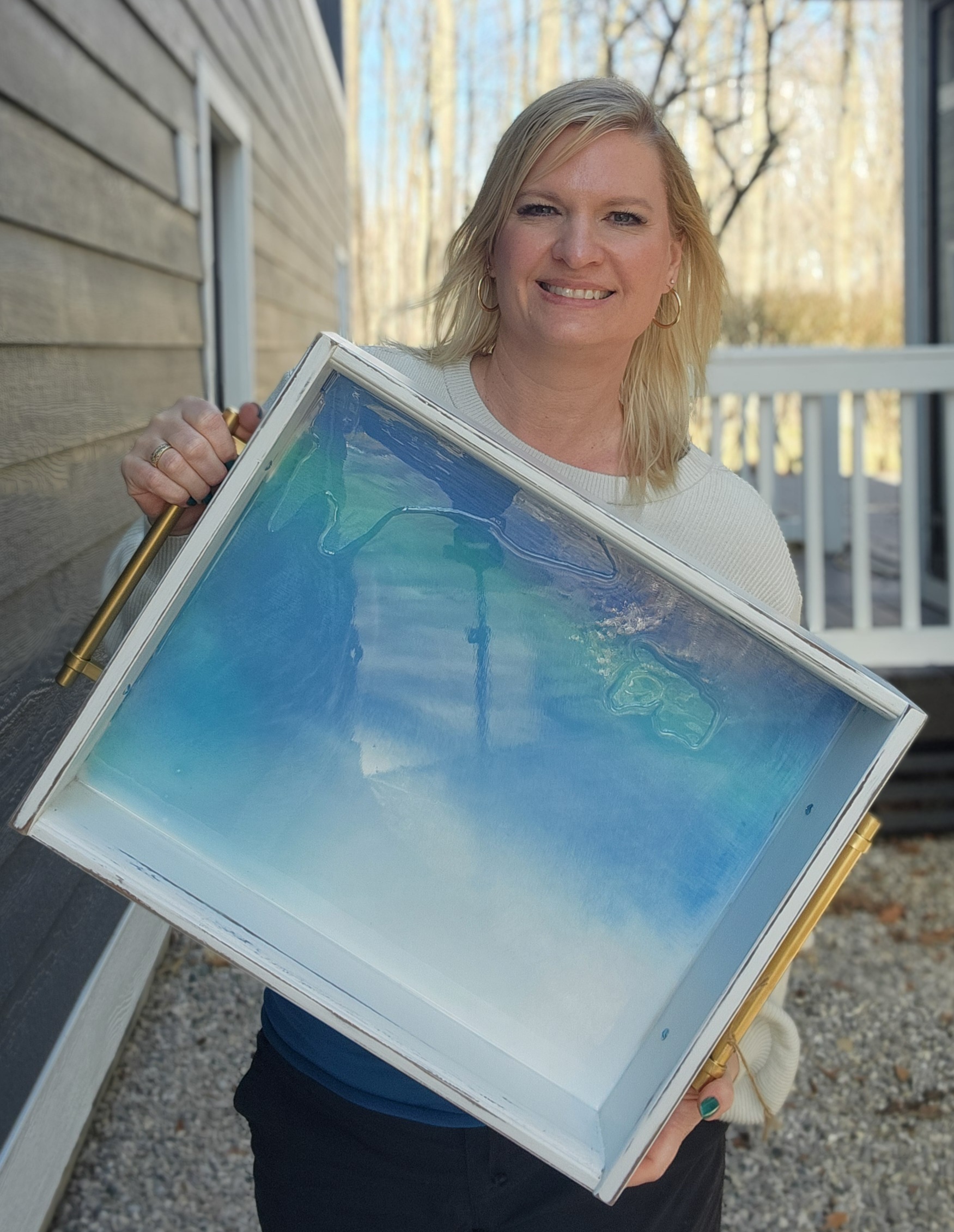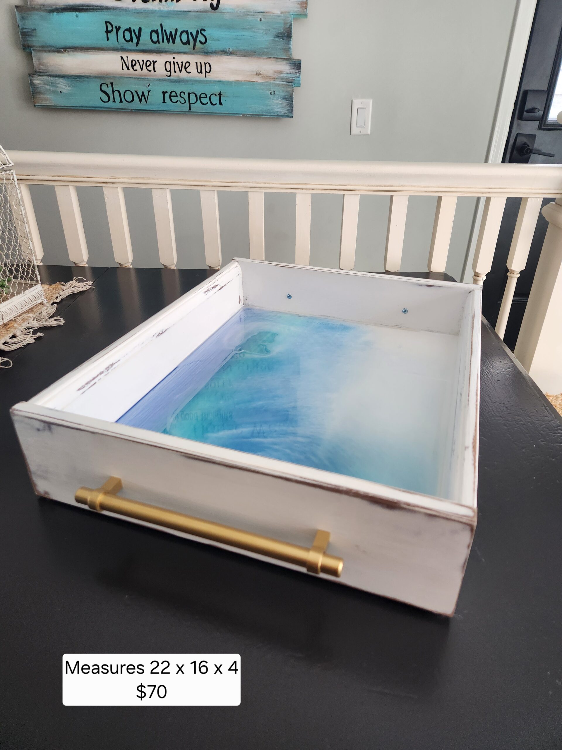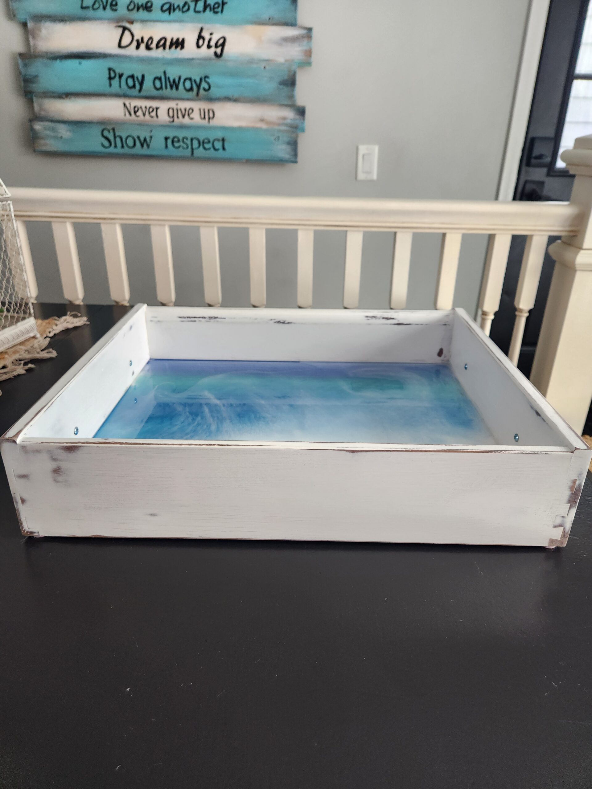 Beautiful solid wood serving tray with a resin pour lake design, creating the look of peaceful water along a shoreline. The layered resin adds depth and movement, giving it a realistic lake-inspired appearance. Finished with sturdy handles, making it both decorative and functional.
