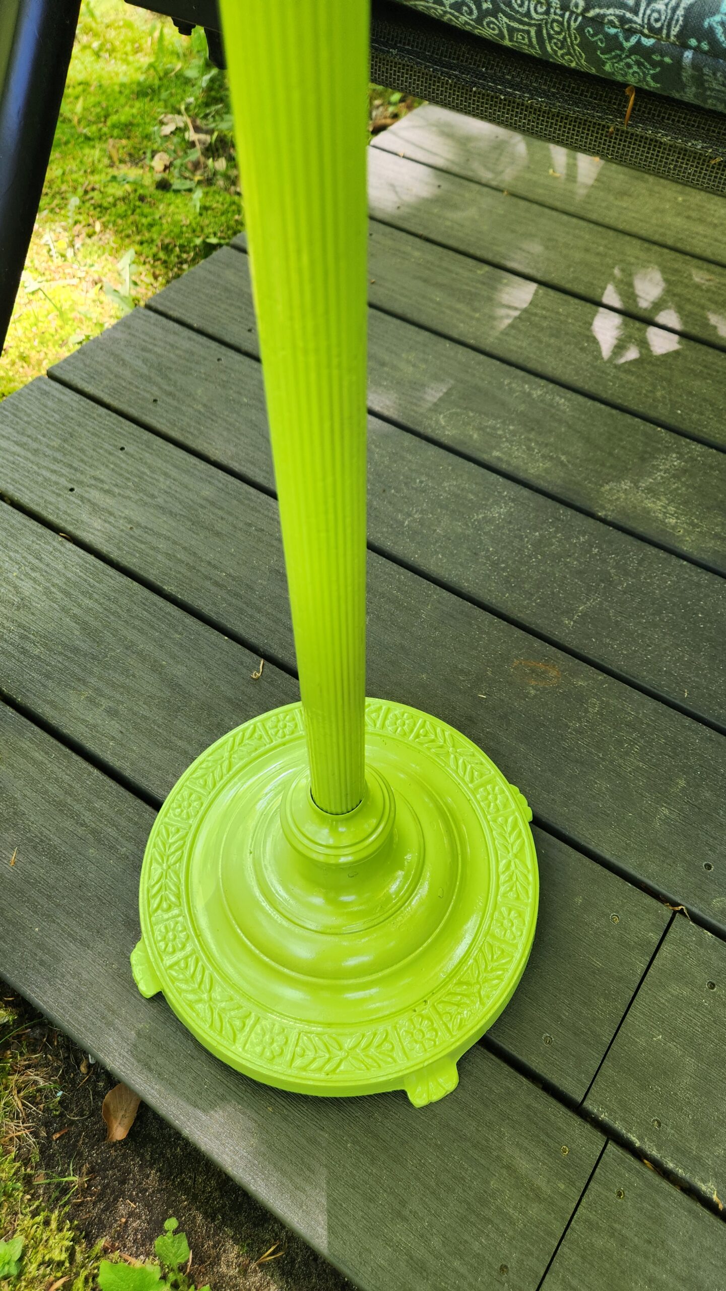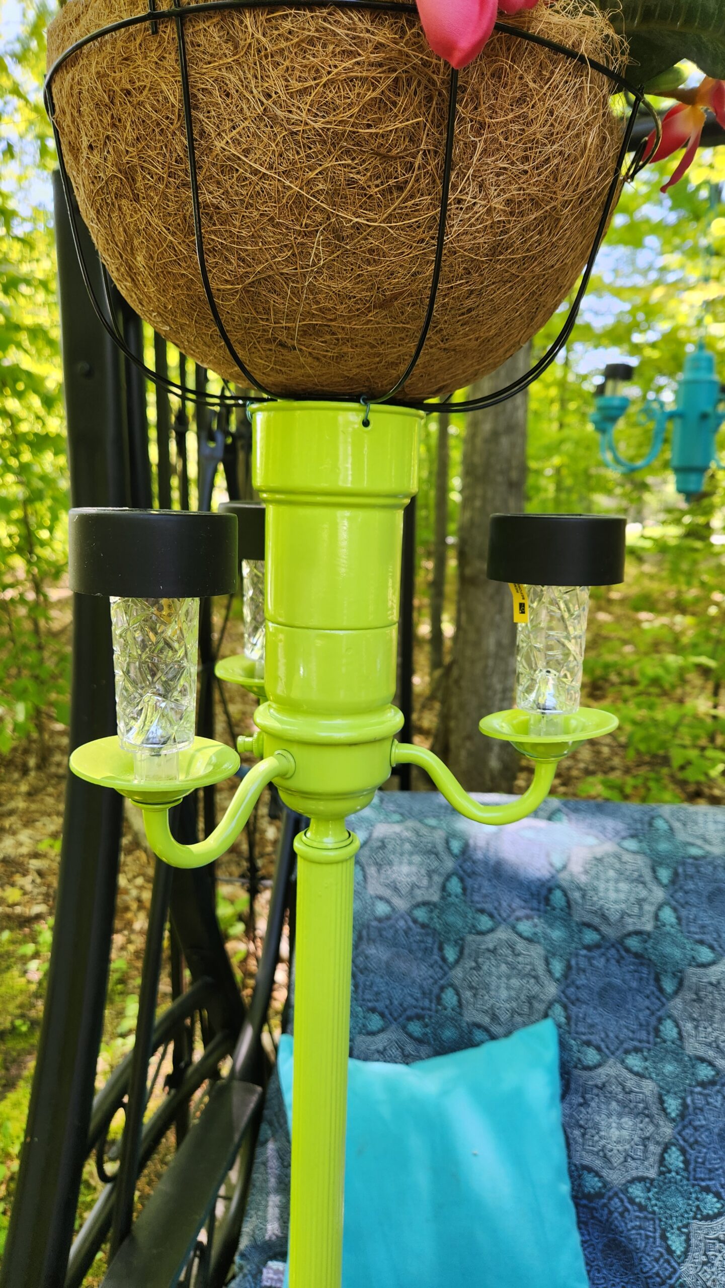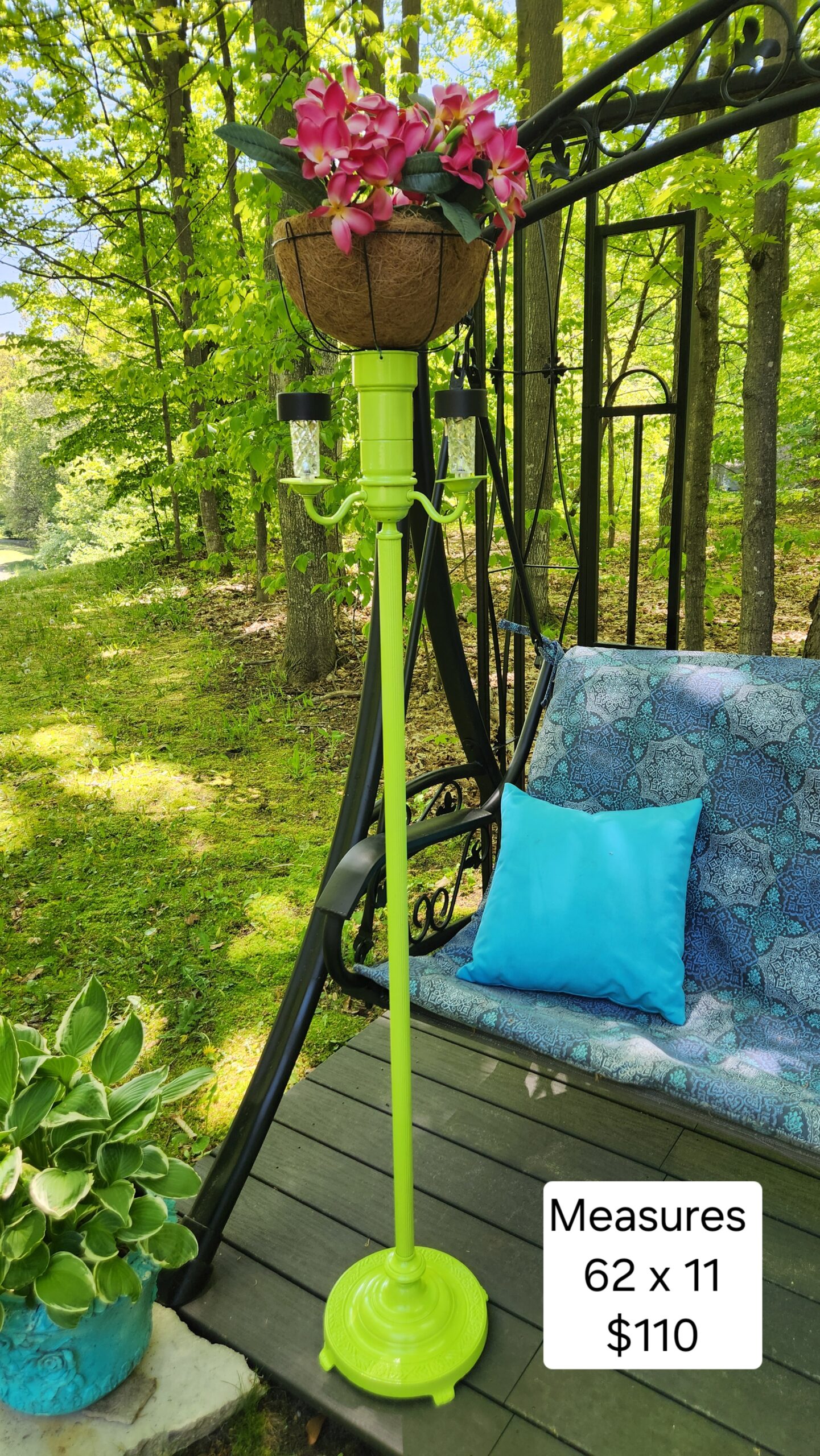 Give your plants a stylish new home with this unique plant stand & solar lights made from a vintage heavy metal lamp! Its sturdy design and vintage charm make it the perfect statement piece for any room or patio. Flowers not included.